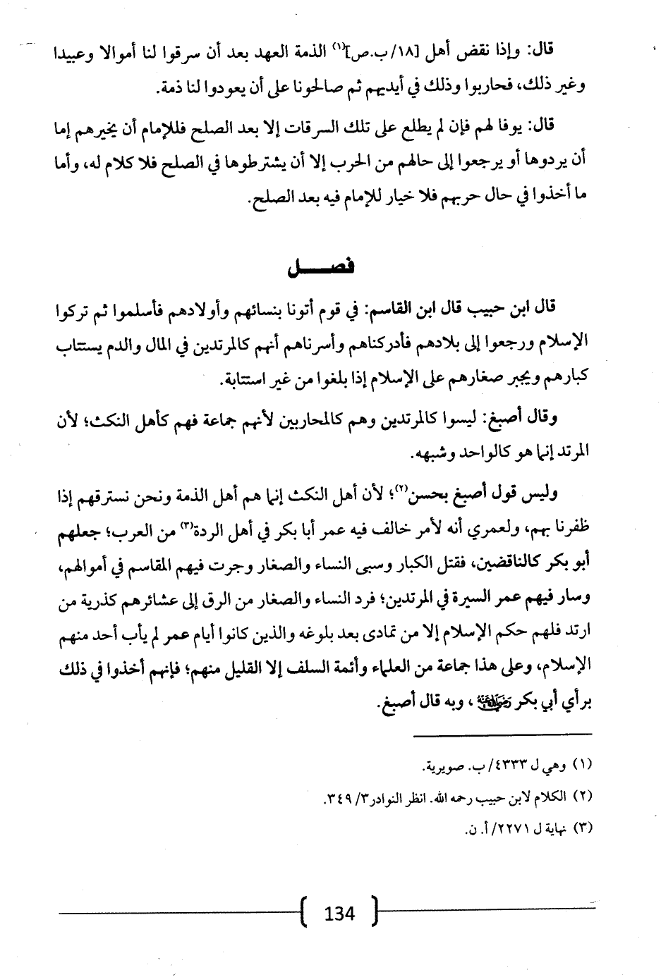 وليس قول أصبغ بحسن؛ لأن أهل النكث إنما هم أهل الذمة ونحن نسترقهم إذا ظفرنا بهم، ولعمري أنه لأمر خالف فيه عمر أبا بكر في أهل الردة من العرب؛ جعلهم أبو بكر كالناقضين، فقتل الكبار وسبى النساء والصغار وجرت فيهم المقاسم في أموالهم، وسار فيهم عمر السيرة في المرتدين؛ فرد النساء والصغار من الرق إلى عشائرهم كذرية من ارتد فلهم حكم الإسلام إلا من تمادى بعد بلوغه والذين كانوا أيام عمر لم يأب أحد منهم الإسلام، وعلى هذا جماعة من العلماء وأئمة السلف إلا القليل منهم؛ فإنهم أخذوا في ذلك برأي أبي بكر -رضي الله عنه-، وبه قال أصبغ.