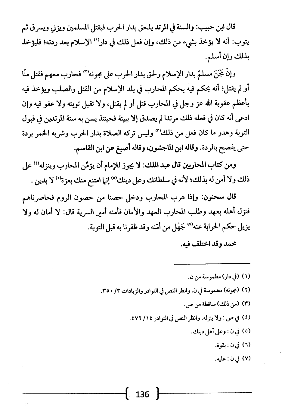 وإن مجن مسلم بدار الإسلام ولحق بدار الحرب على مجونه فحارب معهم فقتل منا أو لم يقتل؛ أنه يحكم فيه بحكم المحارب في بلد الإسلام من القتل والصلب ويؤخذ فيه بأعظم عقوبة الله عز وجل في المحارب قتل أو لم يقتل، ولا تقبل توبته ولا عفو فيه وإن ادعى أنه كان في فعله ذلك مرتداً لم يصدق إلا ببينة فحينئذ يسن به سنة المرتدين في قبول التوبة وهدر ما كان فعل من ذلك وليس تركه الصلاة بدار الحرب وشربه الخمر بردة حتى يفصح بالردة. وقاله ابن الماجشون، وقال أصبغ عن ابن القاسم.