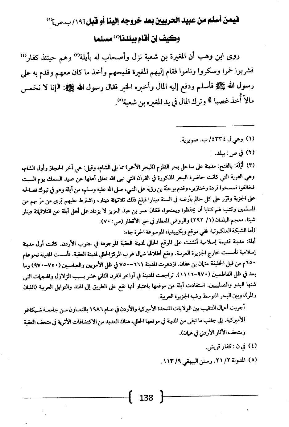 روى ابن وهب أن المغيرة بن شعبة نزل وأصحاب له بأيلة وهم حينئذ كفار فشربوا خمراً وسكروا وناموا فقال إليهم المغيرة فذبحهم وأخذ ما كان معهم وقدم به على رسول الله -صلى الله عليه وسلم- فأسلم ودفع إليه وأخبره الخبر فقال رسول الله -صلى الله عليه وسلم-: «إنا لا نخمس مالاً أخذ غصباً» وترك المال في يد المغيرة بن شعبة.
