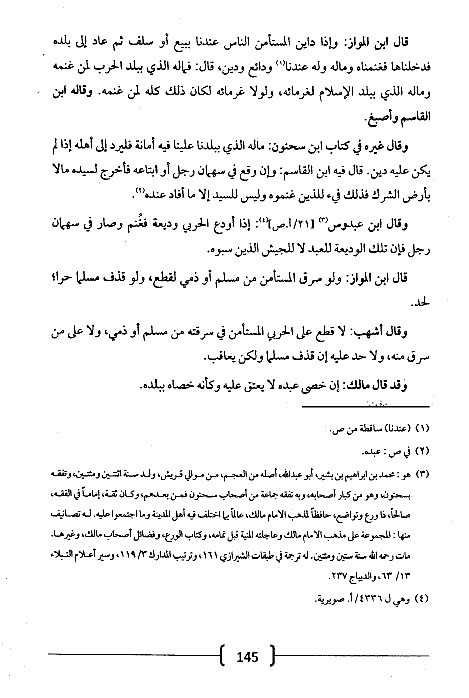 وقال غيره في كتاب ابن سحنون: ماله الذي ببلدنا علينا فيه أمانة فليرد إلى أهله إذا لم يكن عليه دين. قال فيه ابن القاسم: وإن وقع في سهمان رجل أو ابتاعه فأخرج لسيده مالاً بأرض الشرك فذلك فيء للذين غنموه وليس للسيد إلا ما أفاد عنده.