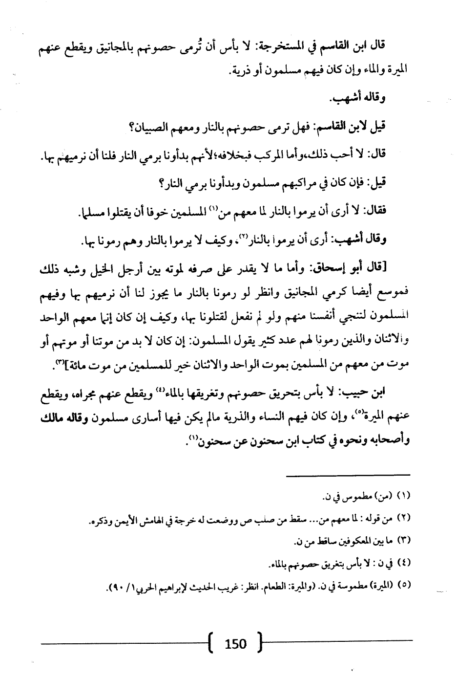 [قال أبو إسحاق: وأما ما لا يقدر على صرفه لموته بين أرجل الخيل وشبه ذلك فموسع أيضاً كرمي المجانيق وانظر لو رمونا بالنار ما يجوز لنا أن نرميهم بها وفيهم المسلمون لننجي أنفسنا منهم ولو لم نفعل لقتلونا بها، وكيف إن كان إنما معهم الواحد والاثنان والذين رمونا لهم عدد كثير يقول المسلمون: إن كان لابد من موتنا أو موتهم أو موت من معهم من المسلمين بموت الواحد والاثنان خير للمسلمين من موت مائة].