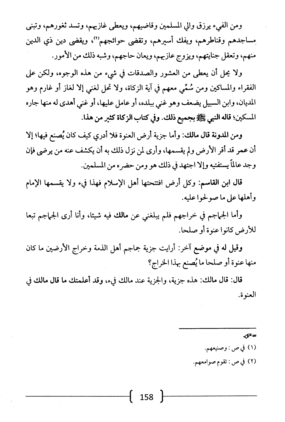 وقيل له في موضع آخر: أرأيت جزية جماجم أهل الذمة وخراج الأرضين ما كان منها عنوة أو صلحاً ما يصنع بهذا الخراج؟