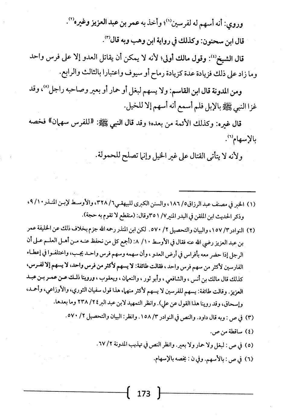 قال غيره: وكذلك الأئمة من بعده؛ وقد قال النبي -صلى الله عليه وسلم-: «للفرس سهمان» فخصه بالإسهام.