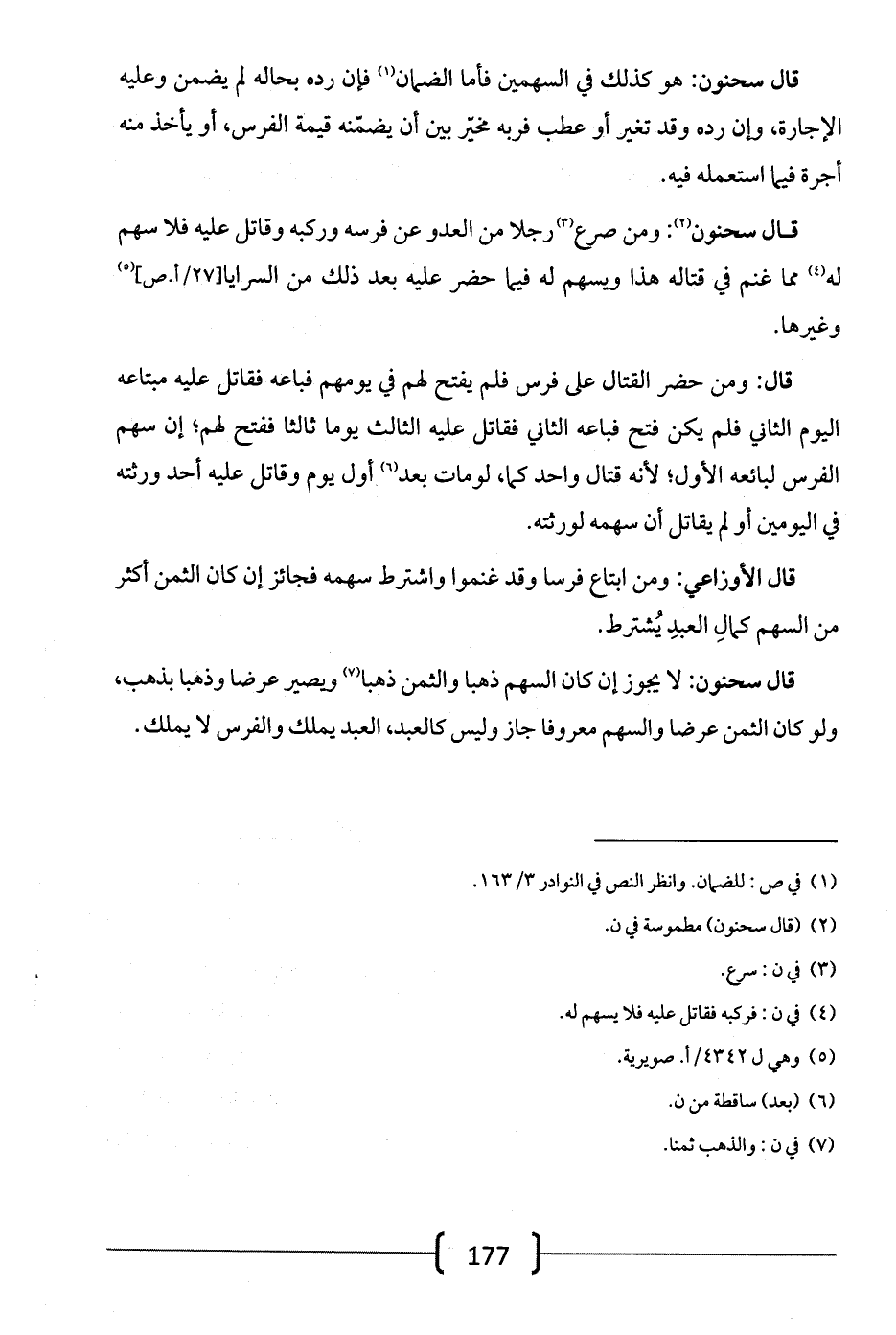 قال سحنون: لا يجوز إن كان السهم ذهباً والثمن ذهباً ويصير عرضاً وذهباً بذهب، ولو كان الثمن عرضاً والسهم معروفاً جاز وليس كالعبد، العبد يملك والفرس لا يملك.