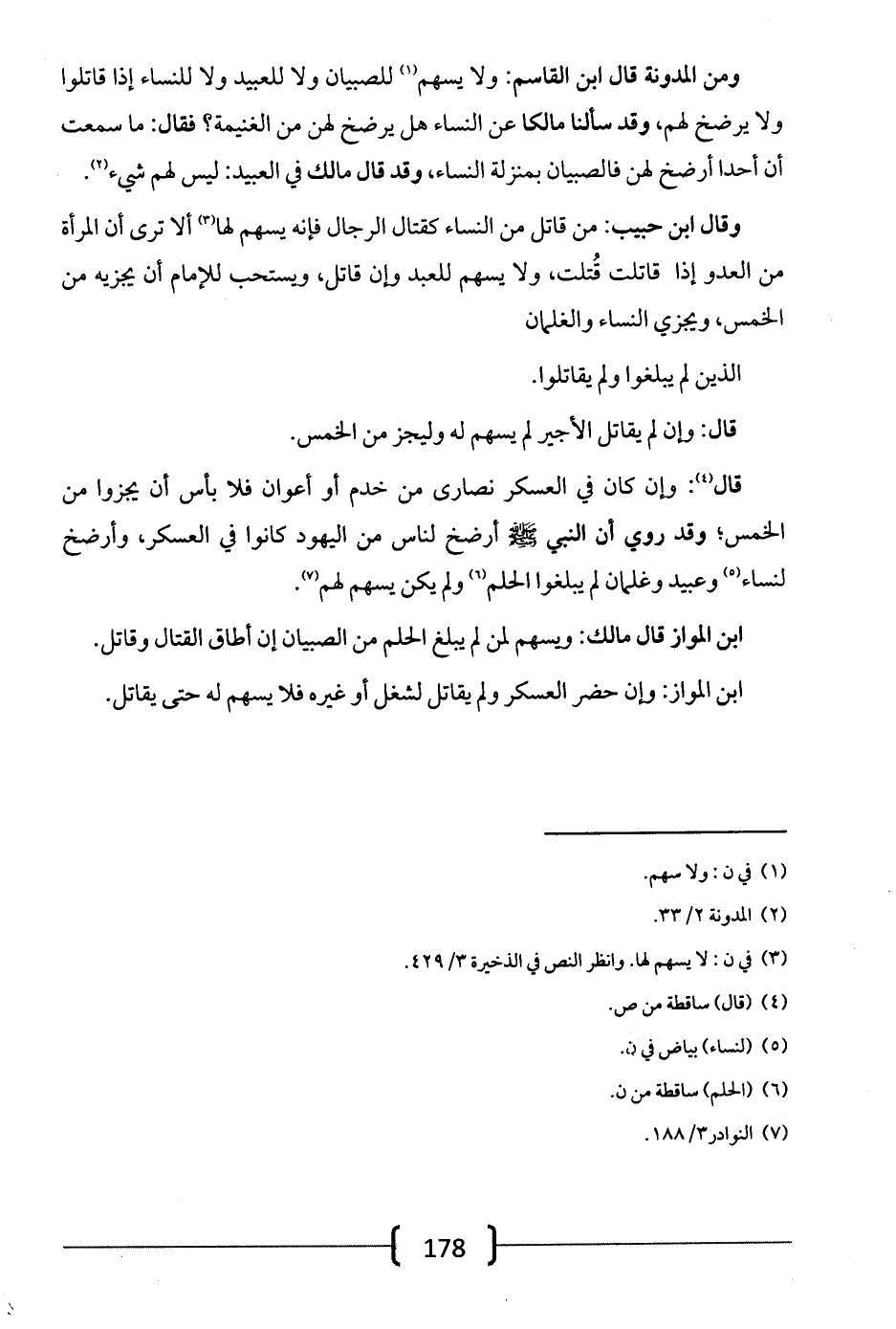 ومن المدونة قال ابن القاسم: ولا يسهم للصبيان ولا للعبيد ولا للنساء إذا قاتلوا ولا يرضخ لهم، وقد سألنا مالكاً عن النساء هل يرضخ لهن من الغنيمة؟ فقال: ما سمعت أن أحداً أرضخ لهن من الغنيمة؟ فقال: ما سمعت أن أحداً أرضخ لهن فالصبيان بمنزلة النساء، وقد قال مالك في العبيد: ليس لهم شيء.
