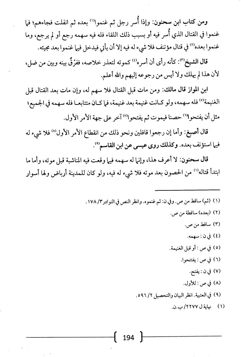 ومن كتاب ابن سحنون: وإذا أسر رجل ثم غنموا بعده ثم انفلت فجاءهم؛ فما غنموا في القتال الذي أسر فيه أو بسبب ذلك اللقاء فله فيه سهمه رجع أو لم يرجع، وما غنموا بعده في قتال مؤتنف فلا شيء له فيه إلا أن يأتي فيدخل فيما غنموا بعد مجيئه.