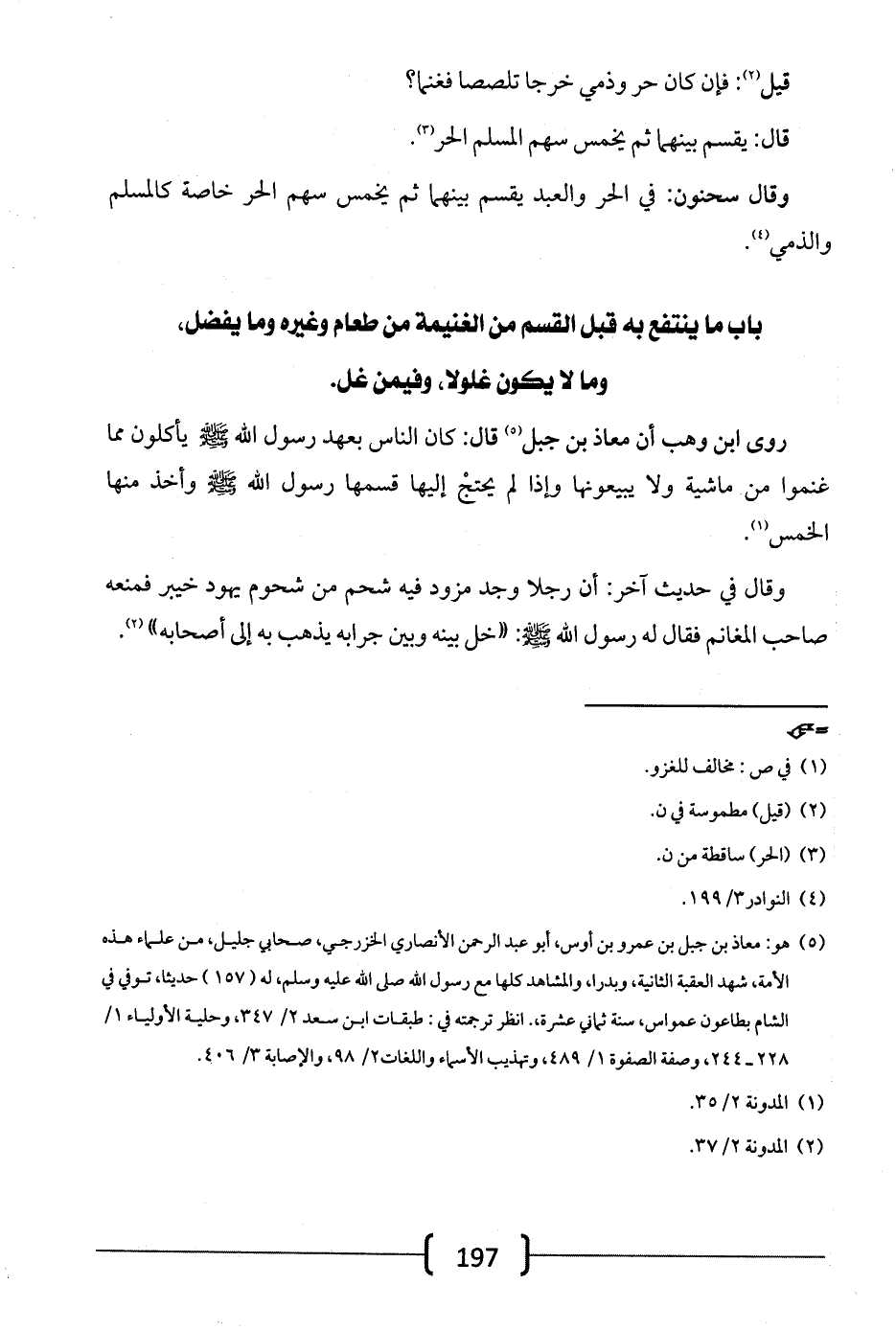 روى ابن وهب أن معاذ بن جبل قال: كان الناس بعهد رسول الله -صلى الله عليه وسلم- يأكلون مما غنموا من ماشية ولا يبيعونها وإذا لم يحتج إليها قسمها رسول الله -صلى الله عليه وسلم- وأخذ منها الخمس.