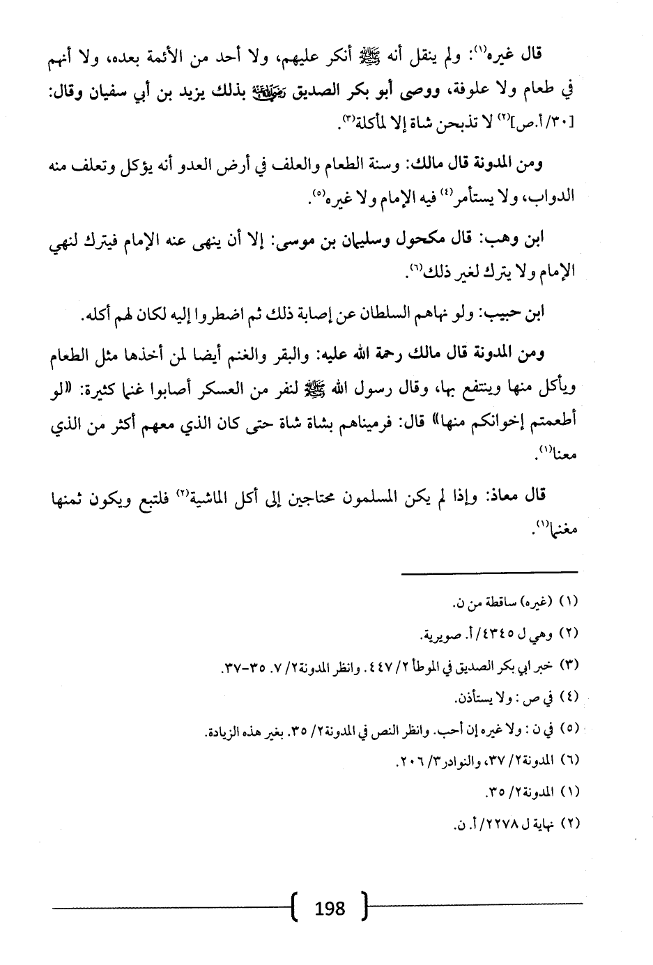 ومن المدونة قال مالك رحمة الله عليه: والبقر والغنم أيضاً لمن أخذها مثل الطعام ويأكل منها وينتفع بها، وقال رسول الله -صلى الله عليه وسلم- لنفر من العسكر أصابوا غنماً كثيرة: «لو أطعمتم إخوانكم منها» قال: فرميناهم بشاة شاة حتى كان الذي معهم أكثر من الذي معنا.