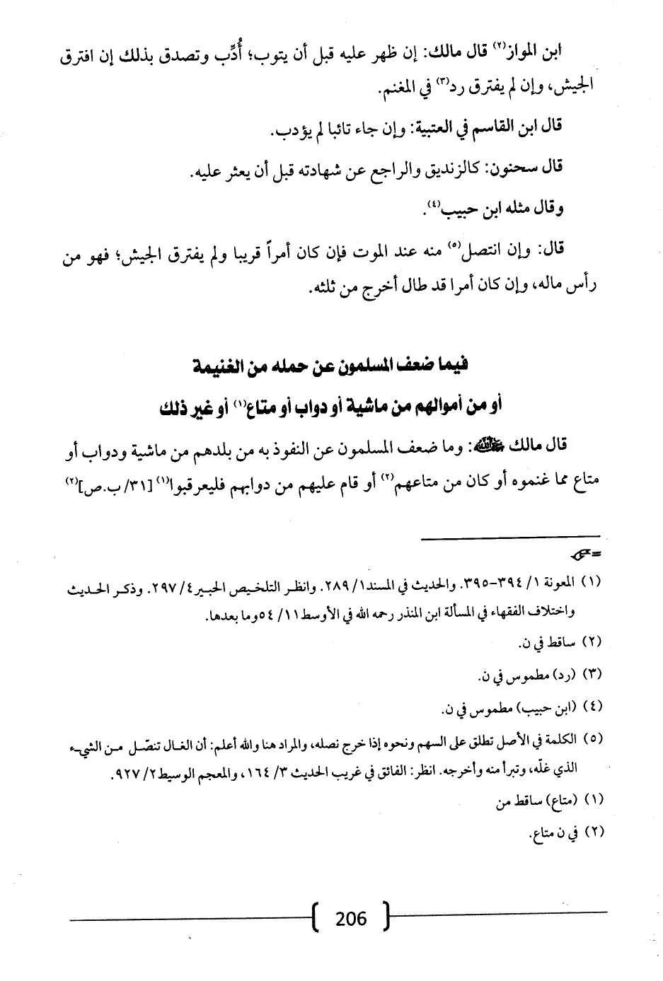 قال مالك -رضي الله عنه-: وما ضعف المسلمون عن النفوذ به من بلدهم من ماشية ودواب أو متاع مما غنموه أو كان من متاعهم أو قام عليهم من دوابهم فليعرقبوا