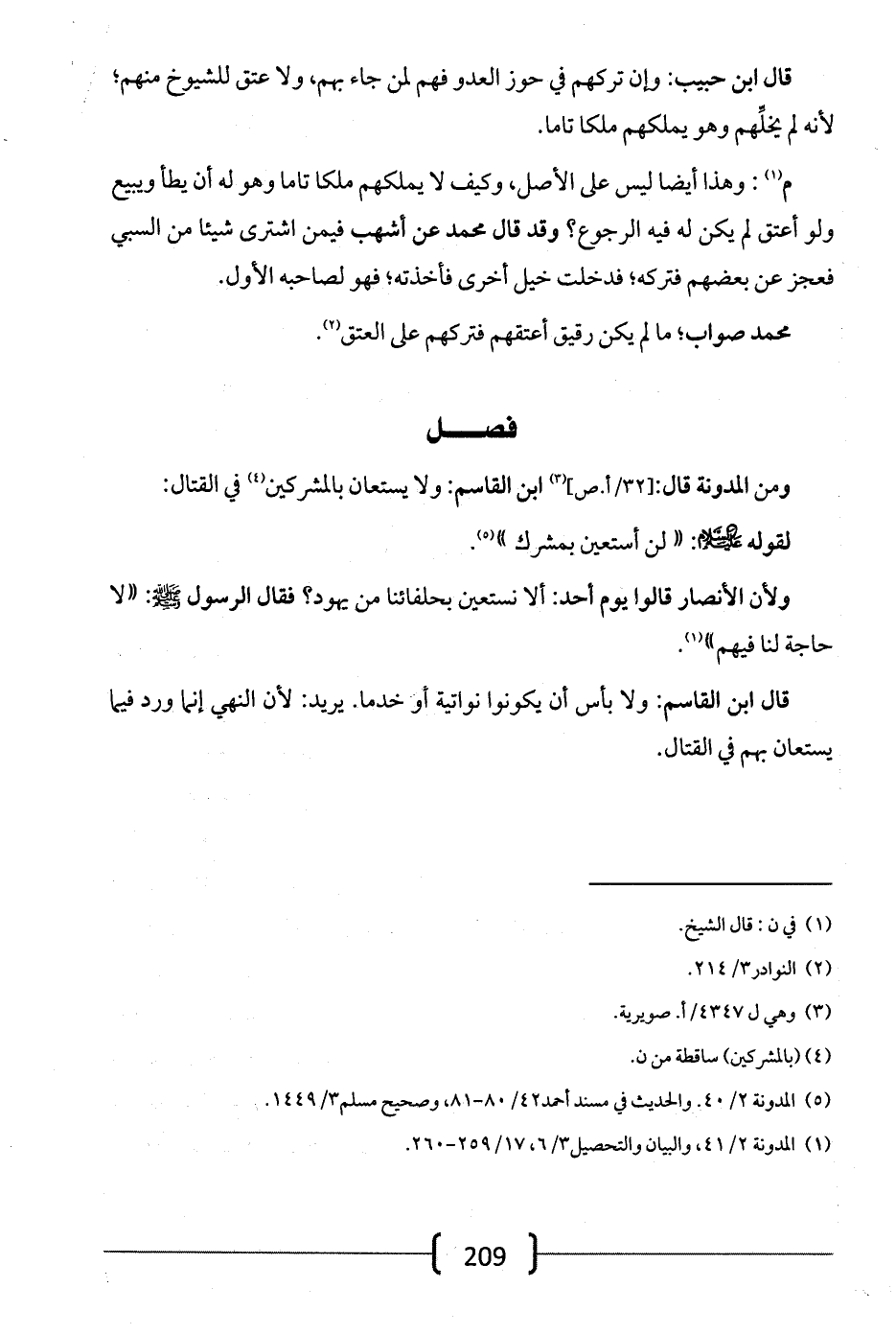 ومن المدونة قال: ابن القاسم: ولا يستعان بالمشركين في القتال: لقوله -عليه السلام-: «لن أستعين بمشرك».