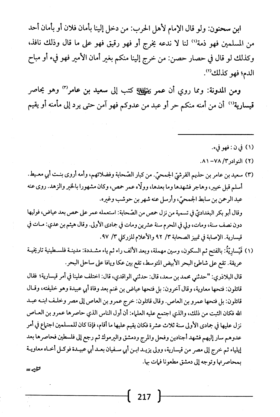 ومن المدونة: ومما روي أن عمر -رضي الله عنه- كتب إلى سعيد بن عامر وهو يحاصر قيسارية أن من أمنه منكم حر أو عبد من عدوكم فهو آمن حتى يرد إلى مأمنه أو يقيم