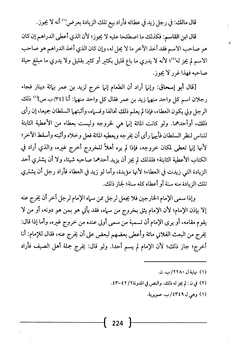 [قال أبو إسحاق: وإنما أراد أن الطعام إنما خرج لزيد بن عمر بمائة دينار فجاء رجلان اسم كل واحد منهما زيد بن عمر فقال كل واحد منهما: أنا ذلك الرجل ولي يكون العطاء، فإذا لم يعلم ذلك تحالفا وقسماه، وأثبتها السلطان جميعاً، إن رأى ذلك، أو أحدهما. ولو كانت المائة إنما هي لخروجه وليست بعطاء من الأعطية الثابتة للناس لنظر السلطان فأيهما رأى أن يخرجه ويعطيه المائة فعل وخلاه وأثبته وأسقط الآخر، لأنها إنما تعطى لمكان خروجه، فإذا لم يره أهلاً للخروج أخرج غيره، والذي أراد في الكتاب الأعطية الثابتة؛ فلذلك لم يجز أن يزيد أحدهما صاحبه شيئاً، ولا أن يشتري أحد الزيادة التي زيدت في العطاء؛ لأنها مؤبدة، وأما لو زيد في العطاء فأراد رجل أن يشتري تلك الزيادة منه سنة أو أعطاه كله سنة؛ لجاز ذلك.