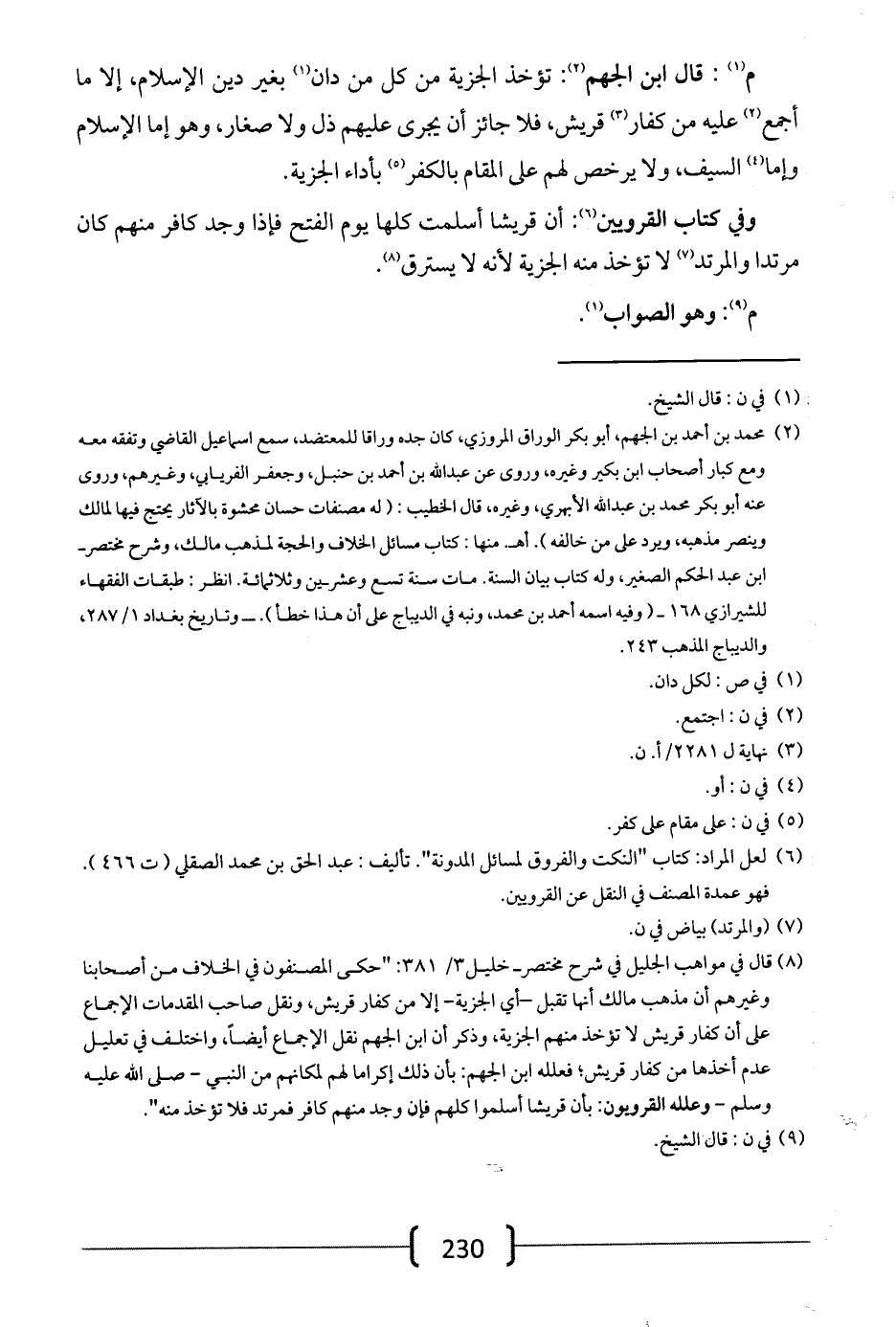 م: قال ابن الجهم: تؤخذ الجزية من كل من دان بغير دين الإسلام، إلا ما أجمع عليه من كفار قريش، فلا جائز أن يجري عليهم ذل ولا صغار، وهو إما الإسلام وإما السيف، ولا يرخص لهم على المقام بالكفر بأداء الجزية.