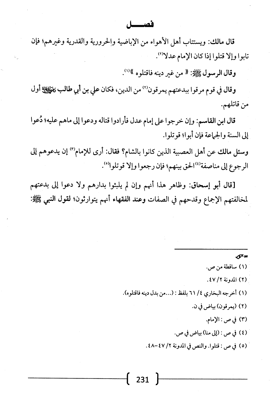 قال ابن القاسم: وإن خرجوا على إمام عدل فأرادوا قتاله ودعوى إلى ما هم عليه؛ دعوا إلى السنة والجماعة فإن أبوا؛ قاتلوا.