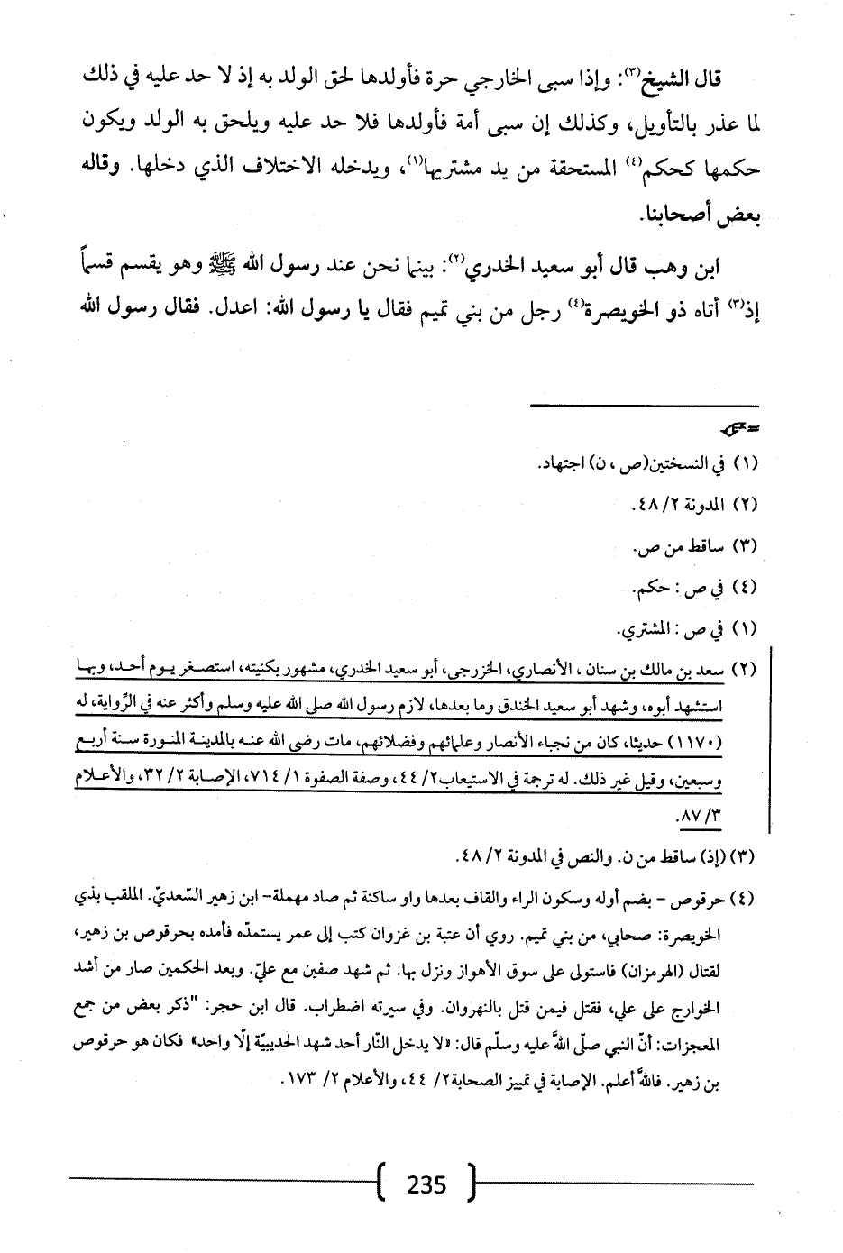ابن وهب قال أبو سعيد الخدري: بينما نحن عند رسول الله -صلى الله عليه وسلم- وهو يقسم قسماً إذ أتاه ذو الخويصرة رجل من بني تميم فقال يا رسول الله: اعدل. فقال رسول الله