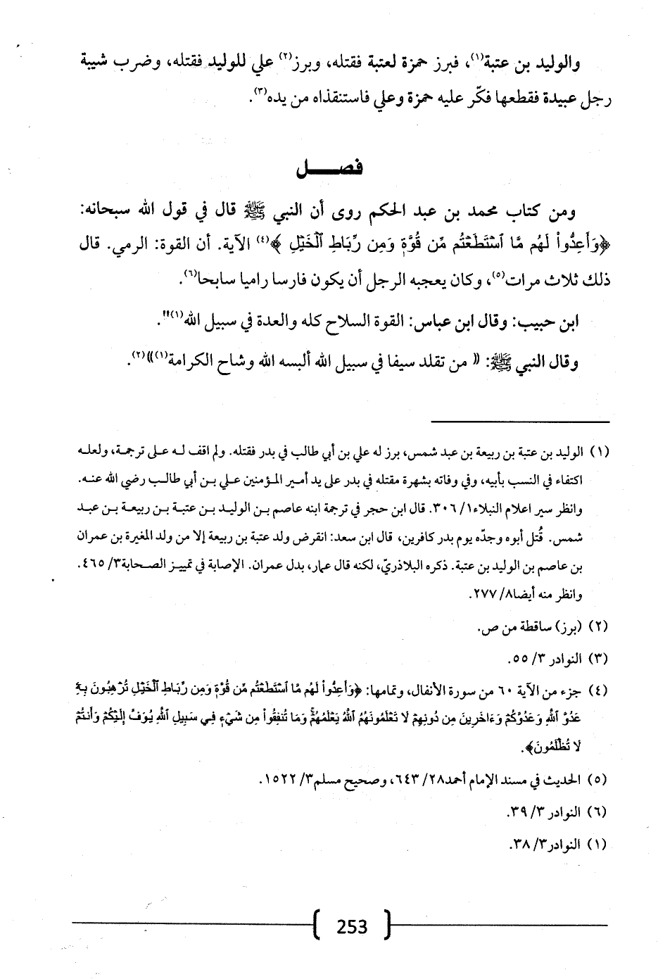 ومن كتاب محمد بن عبد الحكم روى أن النبي -صلى الله عليه وسلم- قال في قول الله سبحانه: {وَأَعِدُّوا لَهُمْ مَا اسْتَطَعْتُمْ مِنْ قُوَّةٍ وَمِنْ رِبَاطِ الْخَيْلِ} الآية. أن القوة: الرمي. قال ذلك ثلاث مرات، وكان يعجبه الرجل أن يكون فارساً رامياً سابحاً.