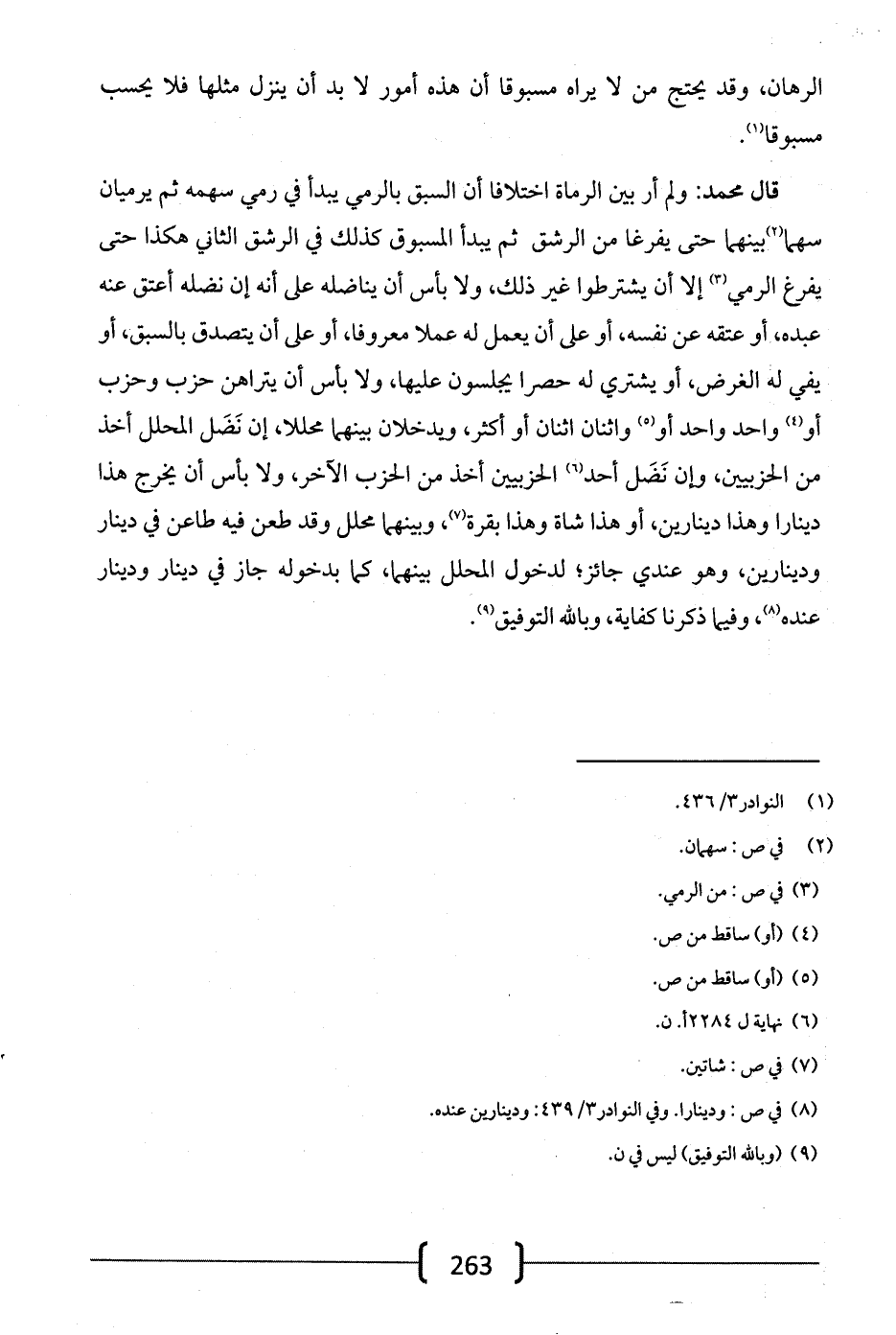 قال محمد: ولم أر بين الرماة اختلافاً أن السبق بالرمي يبدأ في رمي سهمه ثم يرميان سهماً بينهما حتى يفرغا من الرشق ثم يبدأ المسبوق كذلك في الرشق الثاني هكذا حتى يفرغ الرمي إلا أن يشترطوا غير ذلك، ولا بأس أن يناضله على أنه إن نضله أعتق عنه عبده، أو عتقه عن نفسه، أو على أن يعمل له عملاً معروفاً، أو على أن يتصدق بالسبق، أو يفي له الغرض، أو يشتري له حصراً يجلسون عليها، ولا بأس أن يتراهن حزب وحزب أو واحد واحد أو اثنان اثنان أو أكثر، ويدخلان بينهما محللاً، إن نضل المحلل أخذ من الحزبيين، وإن نضل أحد الحزبيين أخذ من الحزب الآخر، ولا بأس أن يخرج هذا ديناراً وهذا دينارين، أو هذا شاة وهذا بقرة، وبينهما محلل وقد طعن فيه طاعن في دينار ودينارين، وهو عندي جائز؛ لدخول المحلل بينهما، كما بدخوله جاز في دينار ودينار عنده، وفيما ذكرنا كفاية، وبالله التوفيق.