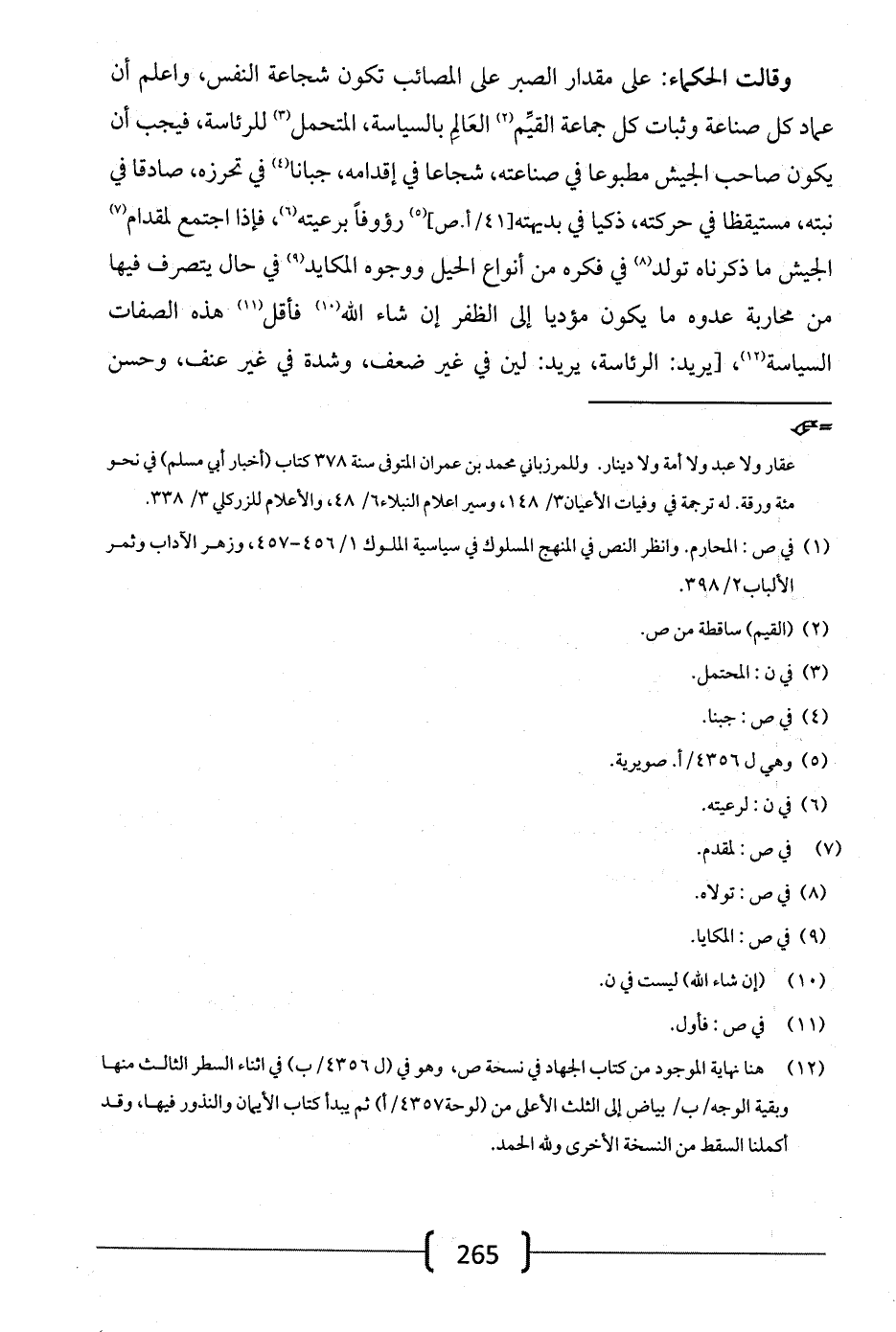 وقالت الحكماء: على مقدار الصبر على المصائب تكون شجاعة النفس، واعلم أن عماد كل صناعة وثبات كل جماعة القيم العالم بالسياسة، المتحمل للرئاسة، فيجب أن يكون صاحب الجيش مطبوعاً في صناعته، شجاعاً في إقدامه، جباناً في تحرزه، صادقاً في نبته، مستيقظاً في حركته، ذكياً في بديهته رؤوفاً برعيته، فإذا اجتمع لمقدام الجيش ما ذكرناه تولد في فكره من أنواع الحيل ووجوه المكايد في حال يتصرف فيها من محاربة عدوه ما يكون مؤدياً إلى الظفر إن شاء الله فأقل هذه الصفات السياسة، [يريد: الرئاسة، يريد: لين في غير ضعف، وشدة في غير عنف، وحسن