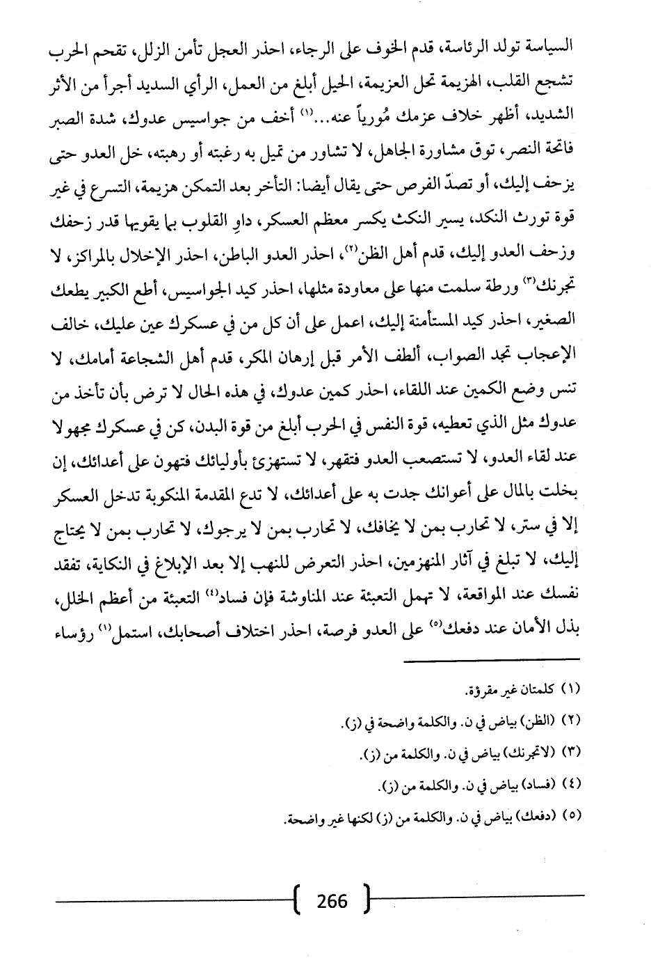 السياسة تولد الرئاسة، قدم الخوف على الرجاء، احذر العجل تأمن الزلل، تقحم الحرب تشجع القلب، الهزيمة تحل العزيمة، الحيل أبلغ من العمل، الرأي السديد أجرأ من الأثر الشديد، أظهر خلاف عزمك مورياً عنه ... أخف من جواسيس عدوك، شدة الصبر فاتحة النصر، توق مشاورة الجاهل، لا تشاور من تميل به رغبته أو رهبته، خل العدو حتى يزحف إليك، أو تصد الفرص حتى يقال أيضاً: التأخر بعد التمكن هزيمة، والتسرع في غير قوة تورث النكد، يسير النكث يكسر معظم العسكر، داو القلوب بما يقويها قدر زحفك وزحف العدو إليك، قدم أهل الظن، احذر العدو الباطن، احذر الإخلال بالمراكز، لا تجرنك ورطة سلمت منها على معاودة مثلها، احذر كيد الجواسيس، أطع الكبير يطعك الصغير، احذر كيد المستأمنة إليك، اعمل على أن كل من في عسكرك عين عليك، خالف الإعجاب تجد الصواب، ألطف الأمر قبل إرهان المكر، قدم أهل الشجاعة أمامك، لا تنس وضع الكمين عند اللقاء، احذر كمين عدوك، في هذه الحال لا ترض بأن تأخذ من عدوك مثل الذي تعطيه، قوة النفس في الحرب أبلغ من قوة البدن، كن في عسكرك مجهولاً عند لقاء العدو، لا تستصعب العدو فتقهر، لا تستهزئ بأوليائك فتهون على أعدائك، إن بخلت بالمال على أعوانك جدت به على أعدائك، لا تدع المقدمة المنكوبة تدخل العسكر إلا في ستر، لا تحارب بمن لا يخافك، لا تحارب بمن لا يرجوك، لا تحارب بمن لا يحتاج إليك، لا تبلغ في آثار المنهزمين، احذر التعرض للنهب إلا بعد الإبلاغ في النكاية، تفقد نفسك عند المواقعة، لا تهمل التعبئة عند المناوشة فإن فساد التعبئة من أعظم الخلل، بذل الأمان عند دفعك على العدو فرصة، احذر اختلاف أصحابك، استمل رؤساء