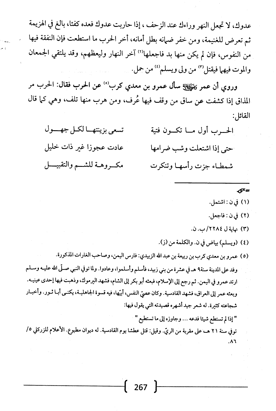 وروي أن عمر -رضي الله عنه- سأل عمرو بن معدي كرب عن الحرب فقال: الحرب مر المذاق فإذا كشفت عن ساق من وقف فيها عرف، ومن هرب منها تلف، وهي كما قال القائل: