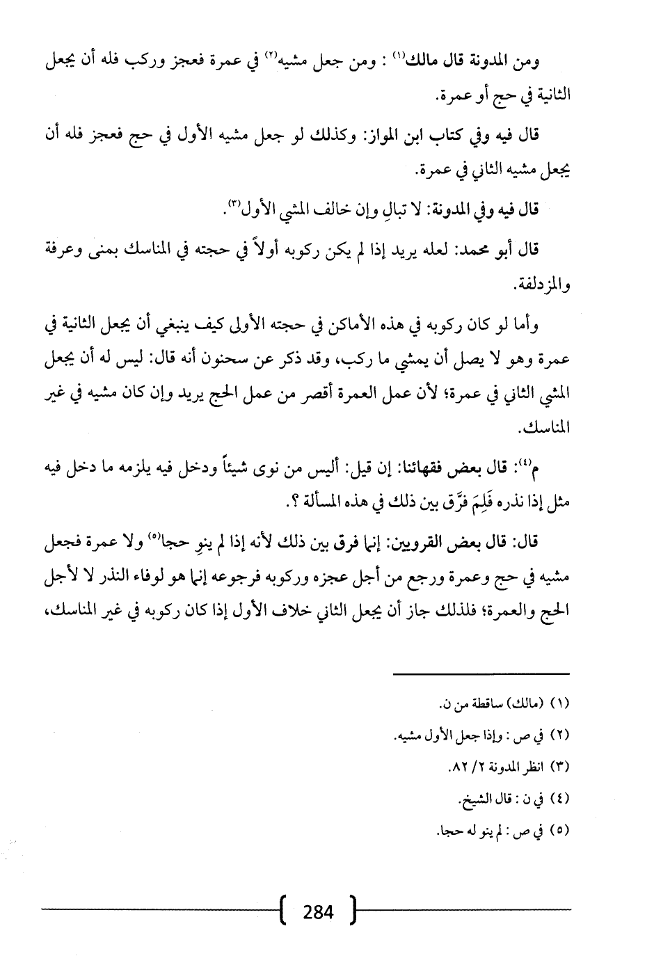وأما لو كان ركوبه في هذه الأماكن في حجته الأولى كيف ينبغي أن يجعل الثانية في عمرة وهو لا يصل أن يمشي ما ركب، وقد ذكر عن سحنون أنه قال: ليس له أن يجعل المشي الثاني في عمرة؛ لأن عمل العمرة أقصر من عمل الحج يريد وإن كان مشيه في غير المناسك.