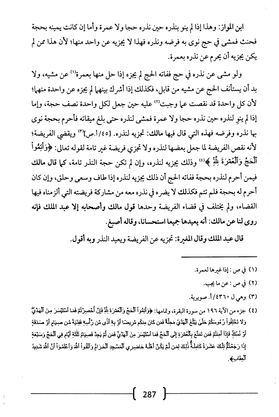 ابن المواز: وهذا إذا لم ينو بنذره حين نذره حجاً ولا عمرة وأما إن كانت يمينه بحجة فحنث فمشى في حج نوى به فرضه ونذره فهذا لا يجزيه عن واحد منها؛ لأن هذا ممن لم يكن يجزيه أو يحرم عن نذره بعمرة.