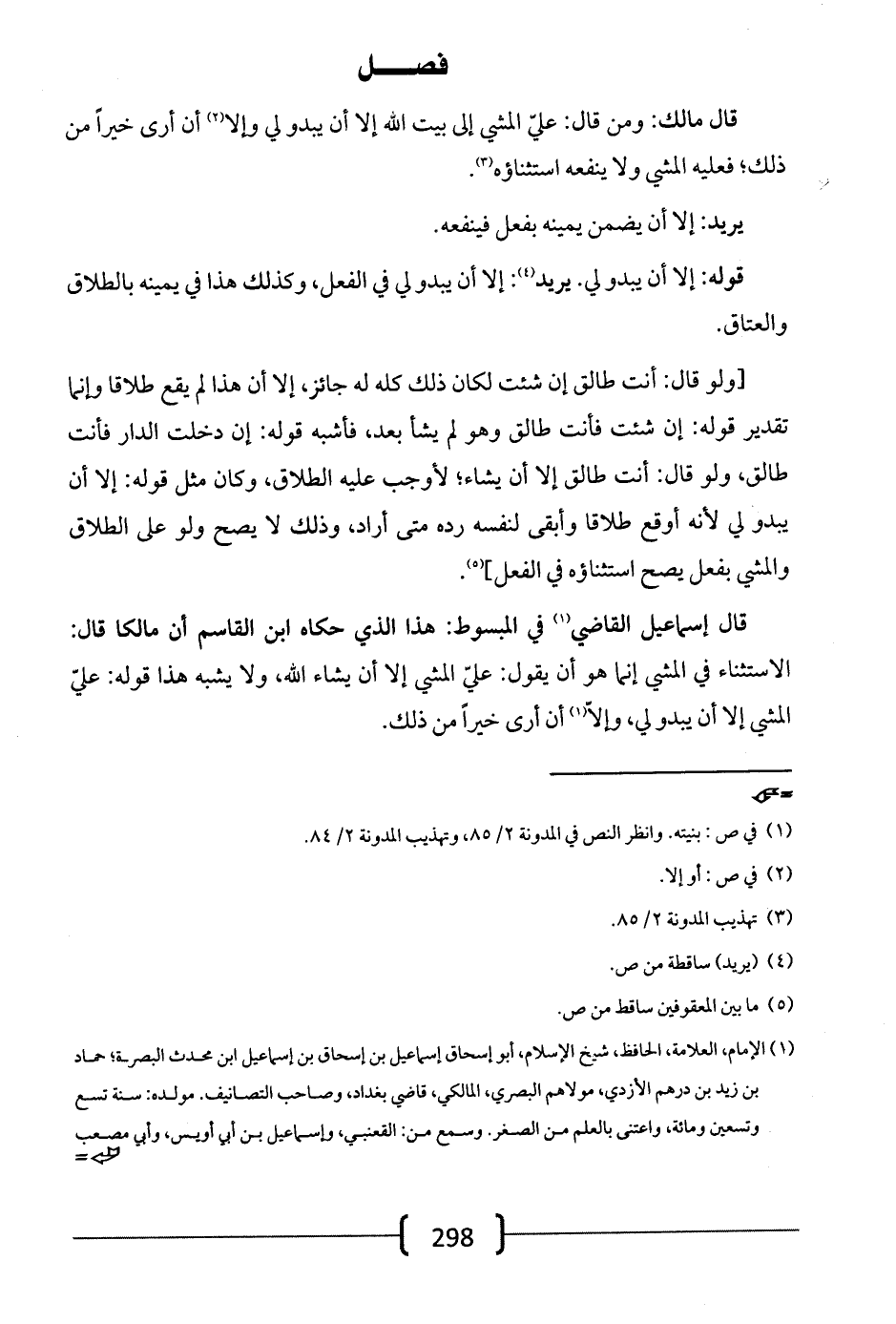 قال إسماعيل القاضي في المبسوط: هذا الذي حكاه ابن القاسم أن مالكاً قال: الاستثناء في المشي إنما هو أن يقول: علي المشي إلا أن يشاء الله، ولا يشبه هذا قوله: علي المشي إلا أن يبدو لي، وإلا أن أرى خيراً من ذلك.