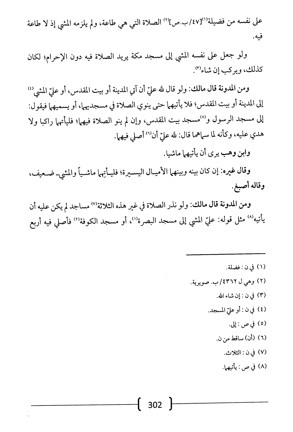ومن المدونة قال مالك: ولو نذر الصلاة في غير هذه الثلاثة مساجد لم يكن عليه أن يأتيه مثل قوله: علي المشي إلى مسجد البصرة، أو مسجد الكوفة فأصلي فيه أربع