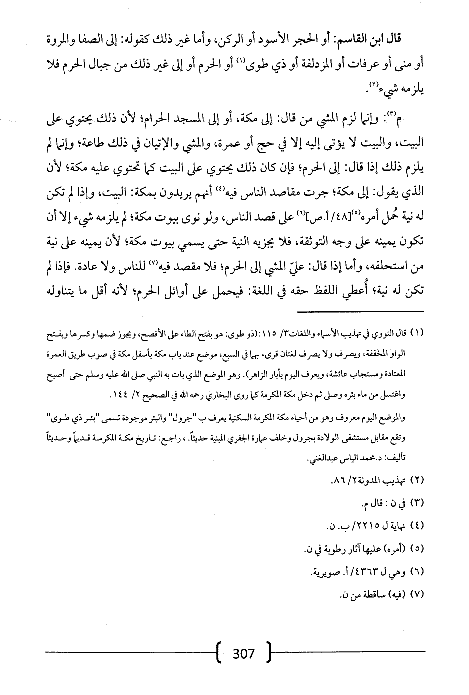 م: وإنما لزم المشي من قال: إلى مكة، أو إلى المسجد الحرام؛ لأن ذلك يحتوي على البيت، والبيت لا يؤتى إليه إلا في حج أو عمرة، والمشي والإتيان في ذلك طاعة؛ وإنما لم يلزمه ذلك إذا قال: إلى الحرم؛ فإن كان ذلك يحتوي على البيت كما تحتوي عليه مكة؛ لأن الذي يقول: إلى مكة؛ جرت مقاصد الناس فيه أنهم يريدون بمكة: البيت، وإذا لم تكن له نية حمل أمره على قصد الناس ولو نرى بيوت مكة؛ لم يلزمه شيء إلا أن تكون يمينه على وجه التوثقة، فلا يجزيه النية حتى يسمي بيوت مكة؛ لأن يمينه على نية من استحلفه، وأما إذا قال: علي المشي إلى الحرم؛ فلا مقصد فيه للناس ولا عادة. فإذا لم تكن له نية؛ أعطي اللفظ حقه في اللغة: فيحمل على أوائل الحرم؛ لأنه أقل ما يتناوله