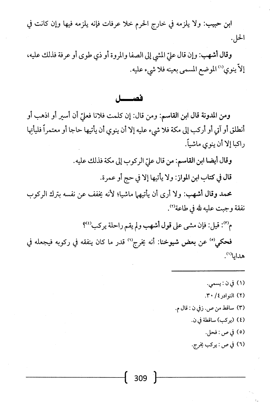 ومن المدونة قال ابن القاسم: ومن قال: إن كلمت فلاناً فعلي أن أسير أو أذهب أو أنطلق أو آتي أو أركب إلى مكة فلا شيء عليه إلا أن ينوي أن يأتيها حاجاً أو معتمراً فليأتها راكباً إلا أن ينوي ماشياً.