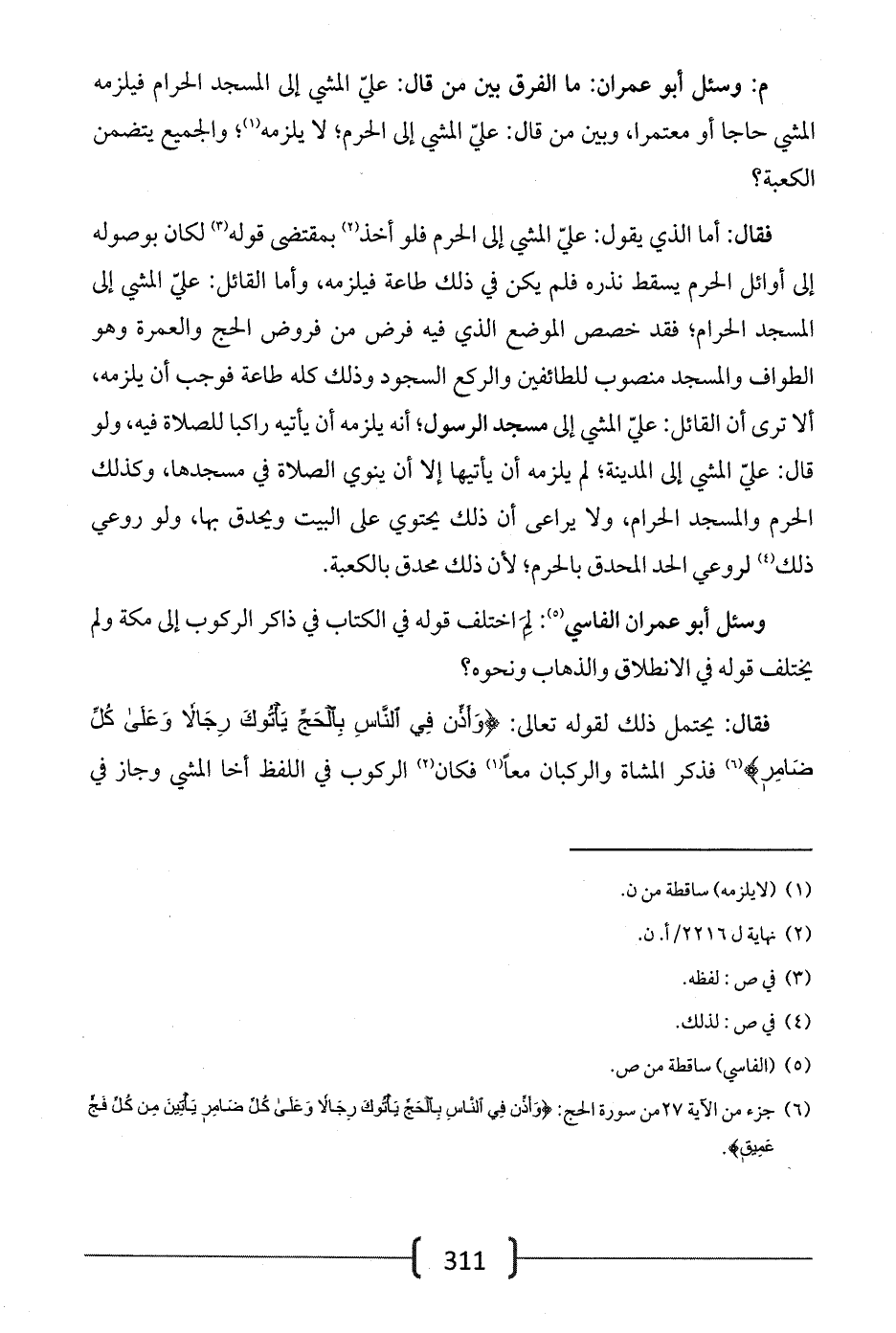 وسئل أبو عمران الفاسي: لم اختلف قوله في الكتاب في ذاكر الركوب إلى مكة ولم يختلف قوله في الانطلاق والذهاب ونحوه؟