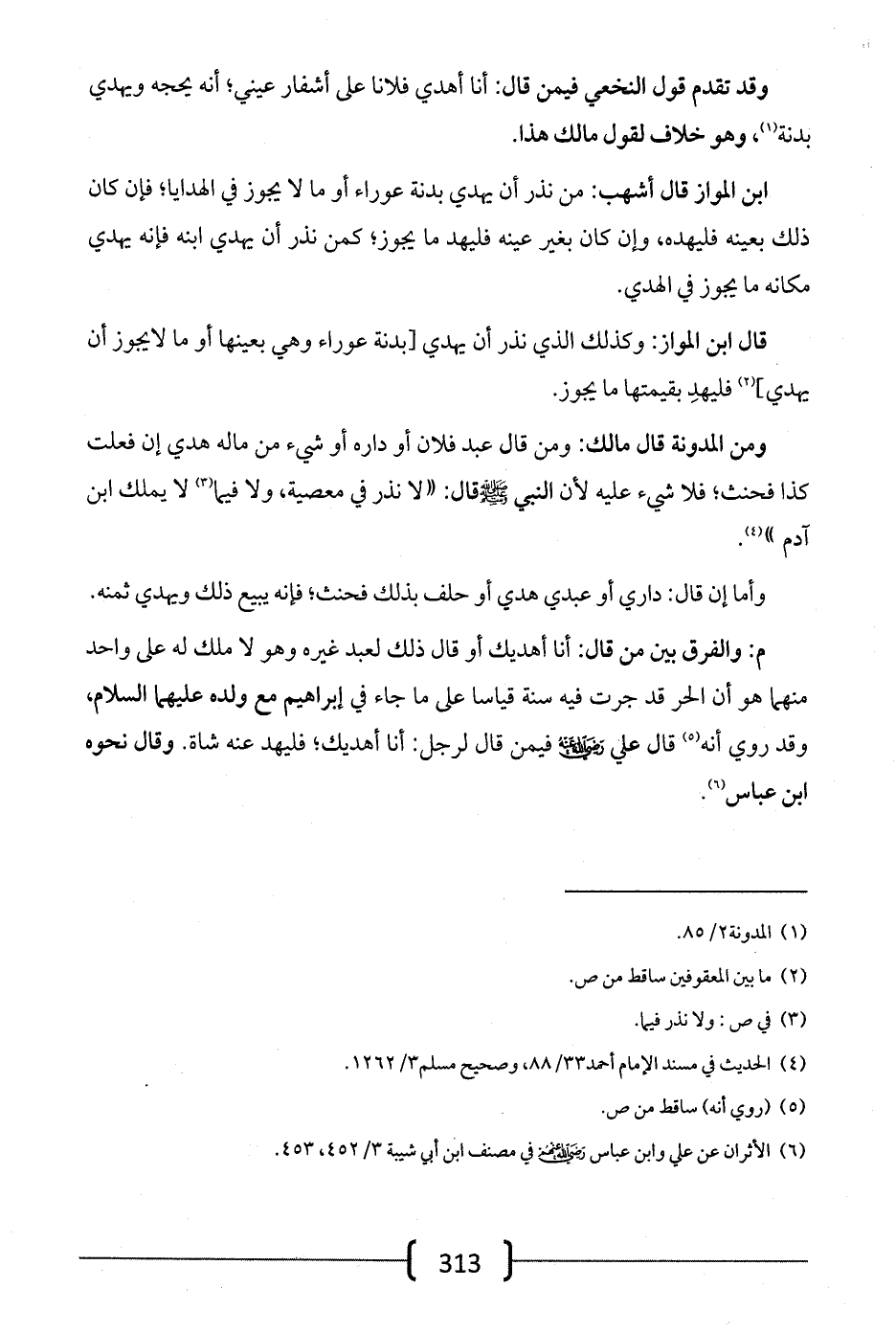 ومن المدونة قال مالك: ومن قال عبد فلان أو داره أو شيء من ماله هدي إن فعلت كذا فحنث؛ فلا شيء عليه لأن النبي -صلى الله عليه وسلم- قال: «لا نذر في معصية، ولا فيما لا يملك ابن آدم».
