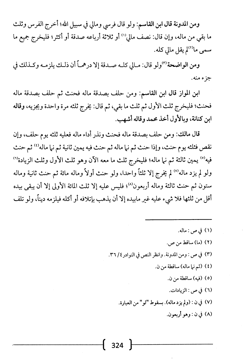 ومن المدونة قال ابن القاسم: ولو قال فرسي ومالي في سبيل الله؛ أخرج الفرس وثلث ما بقي من ماله، وإن قال: نصف مالي أو ثلاثة أرباعه صدقة أو أكثر؛ فليخرج جميع ما سمى ما لم يقل مالي كله.