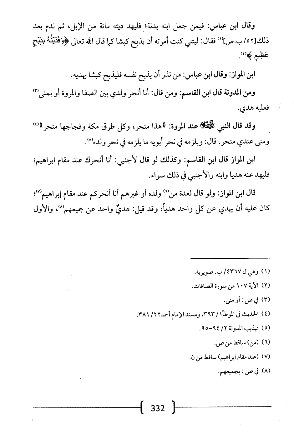 ومن المدونة قال ابن القاسم: ومن قال: أنا أنحر ولدي بين الصفا والمروة أو بمنى فعليه هدي.
