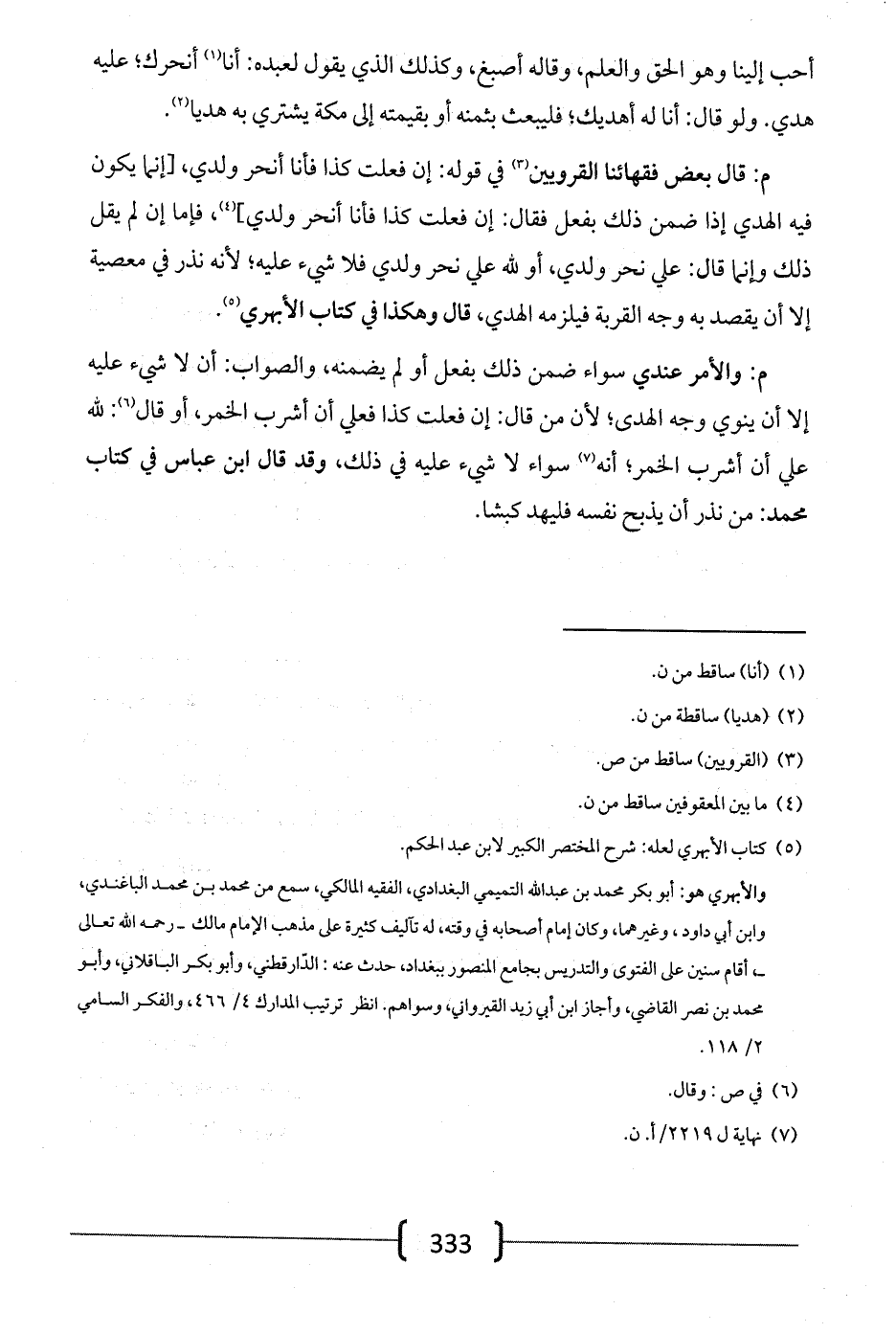 م: قال بعض فقهائنا القرويين في قوله: إن فعلت كذا فأنا أنحر ولدي، [إنما يكون فيه الهدي إذا ضمن ذلك بفعل فقال: إن فعلت كذا فأنا أنحر ولدي]، فأما إن لم يقل ذلك وإنما قال: علي نحر ولدي، أو لله علي نحر ولدي فلا شيء عليه؛ لأنه نذر في معصية إلا أن يقصد به وجه القربة فيلزمه الهدي، قال وهكذا في كتاب الأبهري.