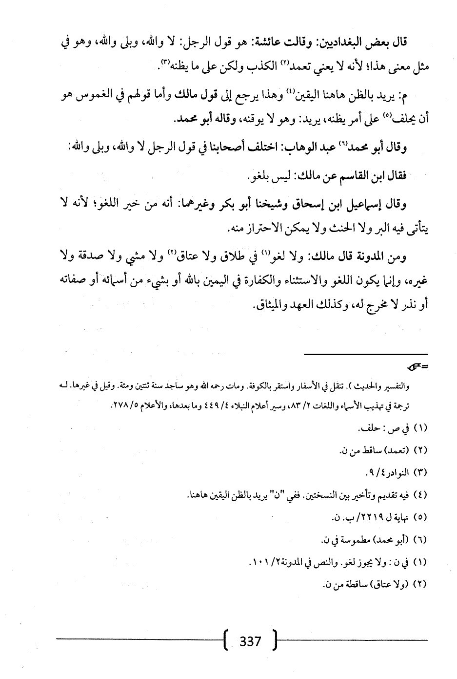 وقال أبو محمد عبد الوهاب: اختلف أصحابنا في قول الرجل لا والله، وبلى والله: فقال ابن القاسم عن مالك: ليس بلغو.