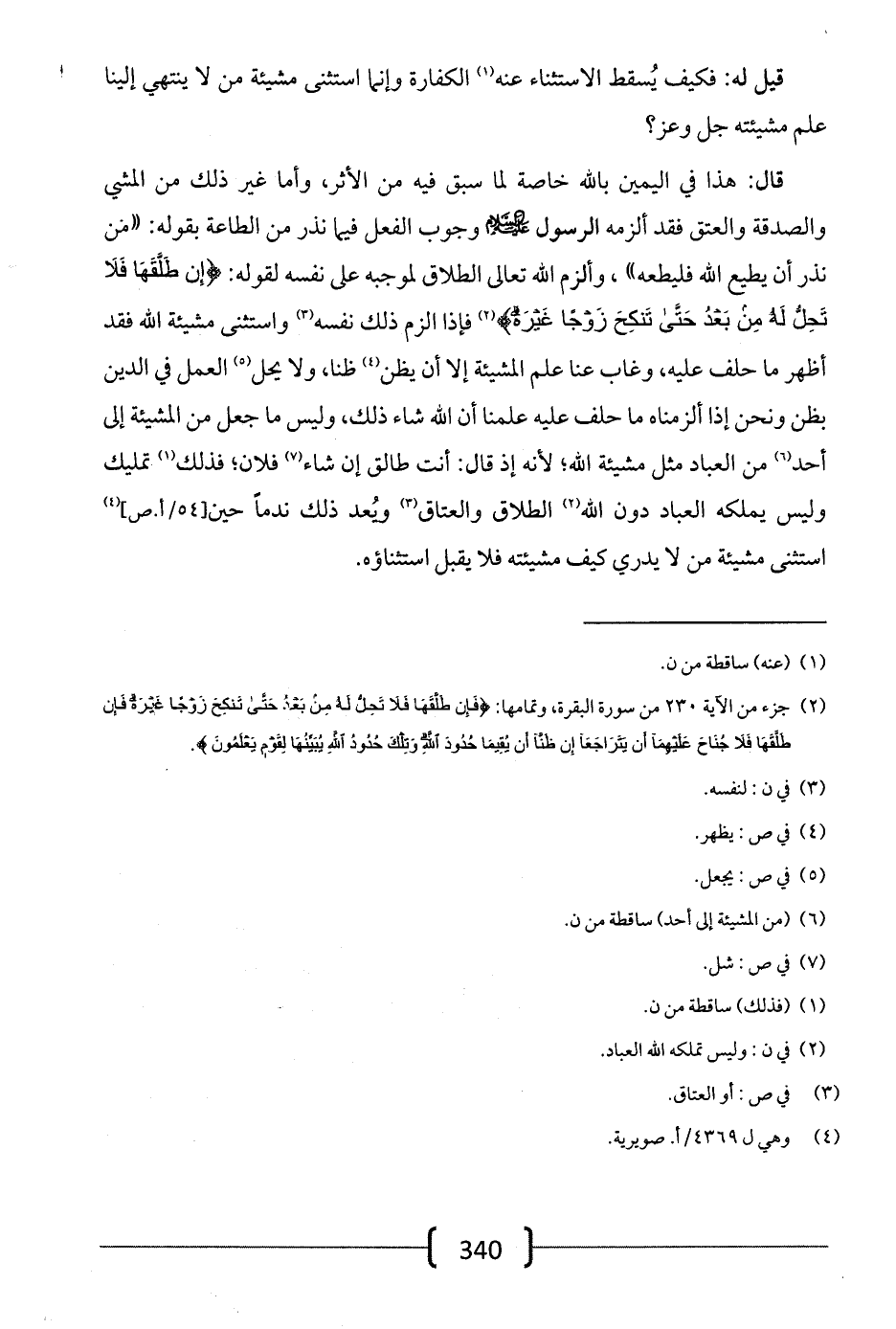 قال: هذا في اليمين بالله خاصة لما سبق فيه من الأثر، وأما غير ذلك من المشي والصدقة والعتق فقد ألزمه الرسول -عليه السلام- وجوب الفعل فيما نذر من الطاعة بقوله: «من نذر أن يطيع الله فليطعه»، وألزم الله تعالى الطلاق لموجبه على نفسه لقوله: {فَإِنْ طَلَّقَهَا فَلا تَحِلُّ لَهُ مِنْ بَعْدُ حَتَّى تَنكِحَ زَوْجًا غَيْرَهُ} فإذا ألزم ذلك نفسه واستثنى مشيئة الله فقد أظهر ما حلف عليه، وغاب عنا علم المشيئة إلا أن الظن ظناً، ولا يحل العمل في الدين بظن ونحن إذا ألزمناه ما حلف عليه علمنا أن الله شاء ذلك، وليس ما جعل من المشيئة إلى أحد من العباد مثل مشيئة الله؛ لأنه إذا قال: أنت طالق إن شاء فلان؛ فذلك تمليك وليس يملكه العباد دون الله الطلاق والعتاق ويعد ذلك ندماً حين استثنى مشيئة من لا يدري كيف مشيئته فلا يقبل استثناؤه.