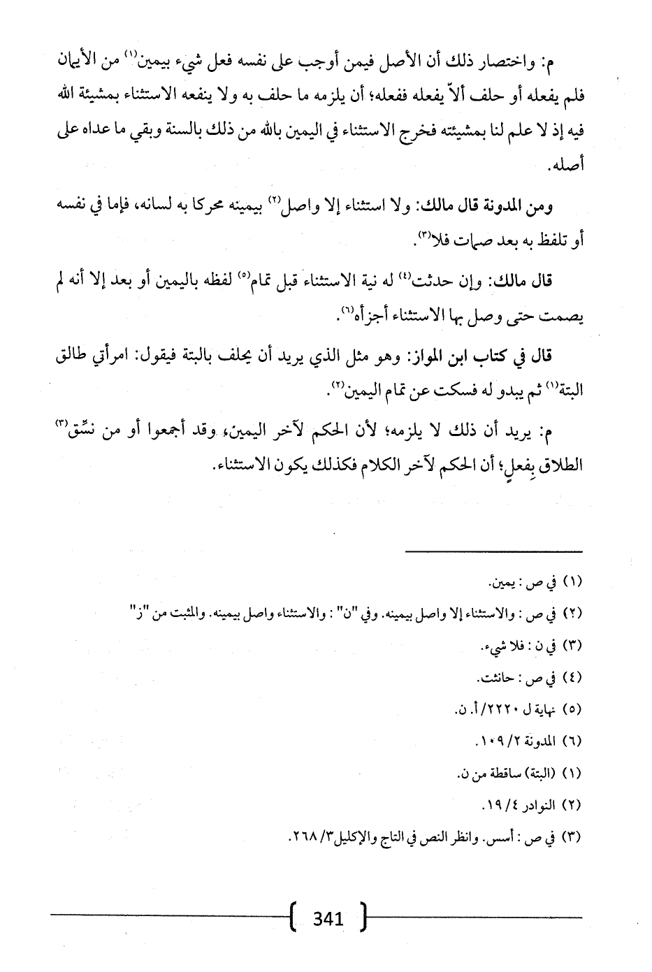 ومن المدونة قال مالك: ولا استثناء إلا واصل بيمينه محركاً به لسانه، فإما في نفسه أو تلفظ به بعد صمات فلا.