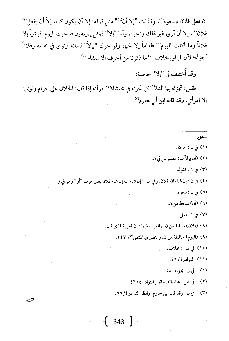 إن فعل فلان ونحوه، وكذلك "إلا أن" مثل قوله: إلا أن يكون كذا، إلا أن يفعل فلان، إلا أن أرى غير ذلك ونحوه، وأما "إلا" فمثل يمينه إن صحبت اليوم قرشياً إلا فلاناً وما أكلت اليوم طعاماً إلا لحماً، ولو حرك "بإلا" لسانه ونوى في نفسه وفلاناً أجزأه؛ لأن الواو بخلاف ما ذكرنا من أحرف الاستثناء.