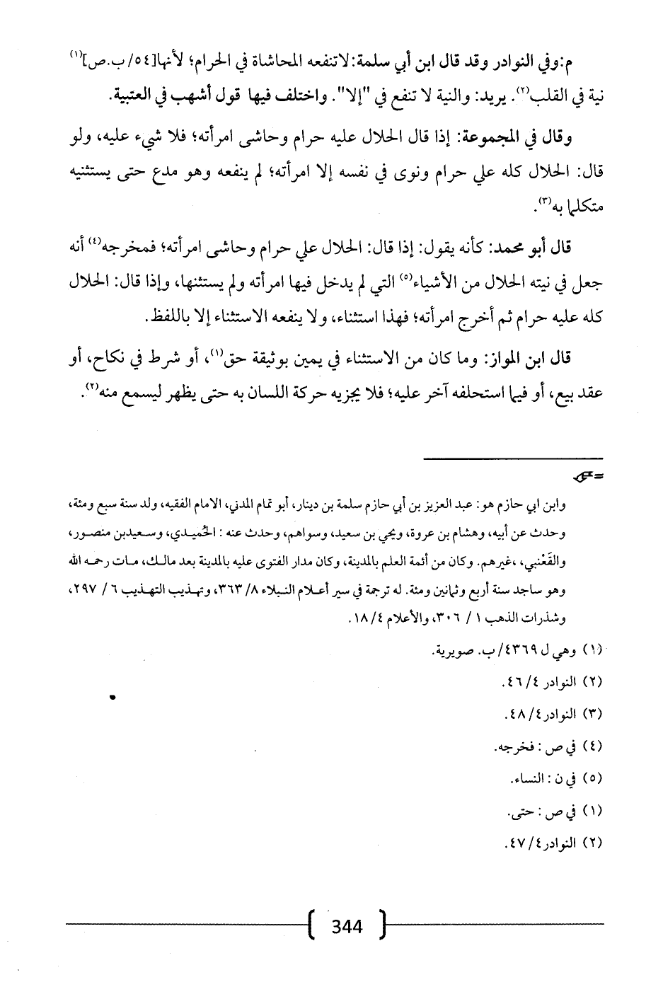 م: وفي النوادر وقد قال ابن أبي سلمة: لا تنفعه المحاشاة في الحرام؛ لأنها نية في القلب. يريد: والنية لا تنفع في "إلا". واختلف فيها قول أشهب في العتبية.