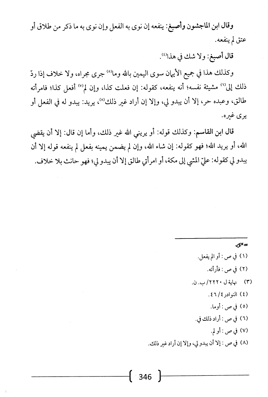 وكذلك هذا في جميع الأيمان سوى اليمين بالله وما جرى مجراه، ولا خلاف إذا رد إلى مشيئة نفسه؛ أنه ينفعه، كقوله: إن فعلت كذا، وإن لم أفعل كذا؛ فامرأته طالق، وعبده حر، إلا أن يبدو لي، وإلا إن أراد غير ذلك، يريد: يبدو لي في الفعل أو يرى غيره.