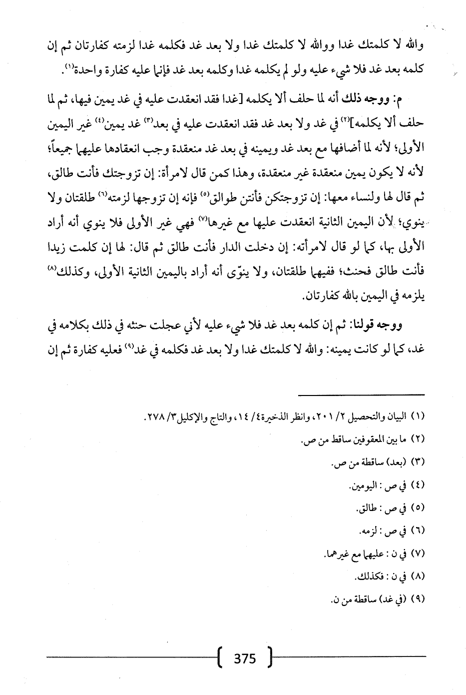 م: ووجه ذلك أنه لما حلف ألا يكلمه [غداً فقد انعقدت عليه في غد يمين فيها، ثم لما حلف ألا يكلمه] في غد ولا بعد غد فقد انعقدت عليه في بعد غد يمين غير اليمين الأولى؛ لأنه لما أضافها مع بعد غد ويمينه في بعد غد منعقدة وجب انعقادها عليهما جميعاً؛ لأنه لا يكون يمين منعقدة غير منعقدة، وهذا كمن قال لامرأته: إن تزوجتك فأنت طالق، ثم قال لها ولنساء معها: إن تزوجتكن فأنتن طوالق فإنه إن تزوجها لزمته طلقتان ولا ينوي؛ لأن اليمين الثانية انعقدت عليها مع غيرها فهي غير الأولى فلا ينوي أنه أراد الأولى بها، كما لو قال لامرأته: إن دخلت الدار فأنت طالق ثم قال: لها إن كلمت زيداً فأنت طالق فحنث؛ ففيهما طلقتان، ولا ينوي أنه أراد باليمين الثانية الأولى، وكذلك يلزمه في اليمين بالله كفارتان.