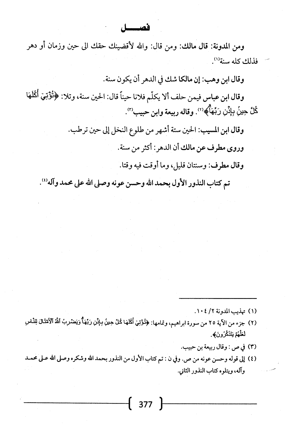 وقال ابن عباس فيمن حلف ألا يكلم فلاناً حيناً قال: الحين سنة، وتلا: {تُؤْتِي أُكُلَهَا كُلَّ حِينٍ بِإِذْنِ رَبِّهَا}. وقاله ربيعة وابن حبيب.