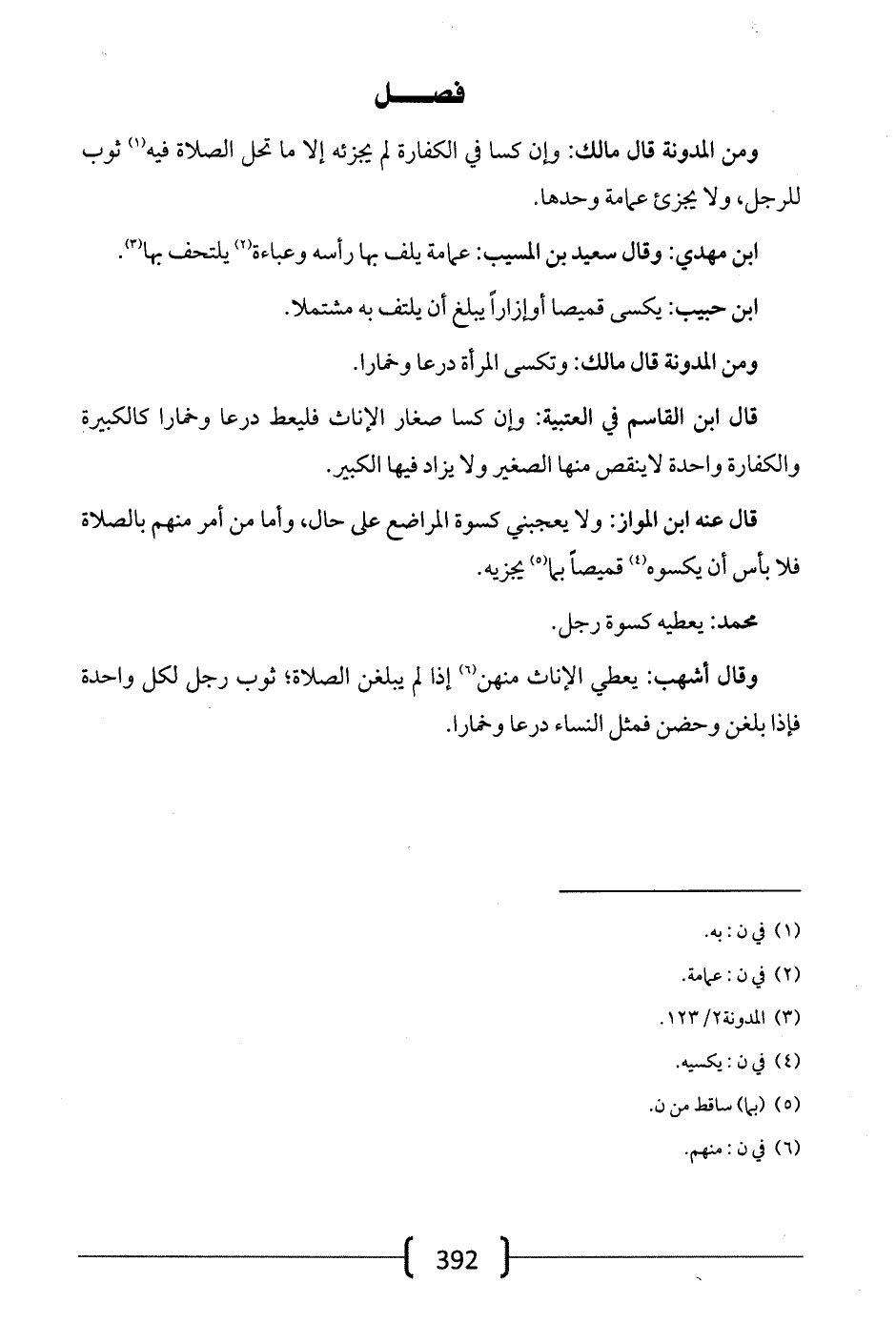 ومن المدونة قال مالك: وإن كسا في الكفارة لم يجزئه إلا ما تحل الصلاة فيه ثوب للرجل، ولا يجزئ عمامة وحدها.