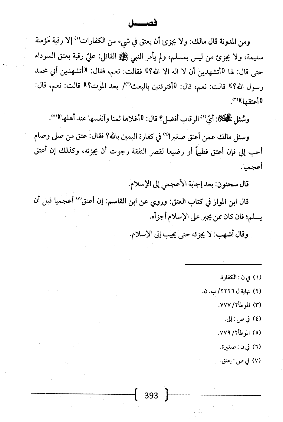 ومن المدونة قال مالك: ولا يجزئ أن يعتق في شيء من الكفارات إلا رقبة مؤمنة سليمة، ولا يجزئ من ليس بمسلم، ولم يأمر النبي -صلى الله عليه وسلم- القائل: علي رقبة بعتق السوداء حتى قال: لها «أتشهدين أن لا إله إلا الله؟» فقالت: نعم، فقال: «أتشهدين أني محمد رسول الله؟» قالت: نعم، قال: «أفتوقنين بالبعث بعد الموت؟» قالت: نعم، قال: «اعتقها».