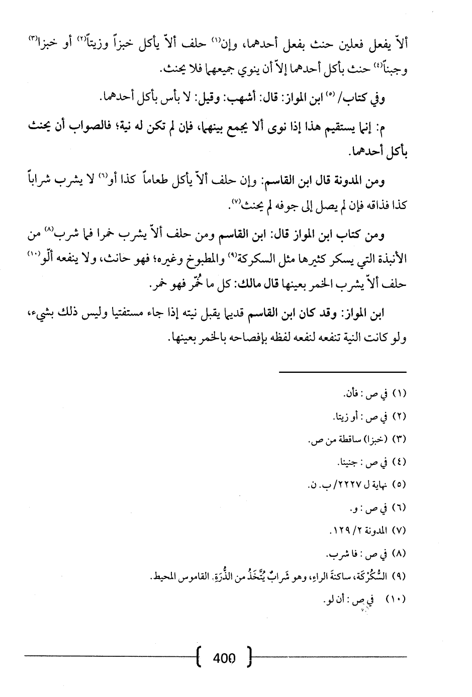 ومن كتاب ابن المواز قال: ابن القاسم ومن حلف ألا يشرب خمراً فما شرب من الأنبذة الني يسكر كثيرها مثل السكركة والمطبوخ وغيره؛ فهو حانث، ولا ينفعه ألو حلف ألا يشرب الخمر بعينها قال مالك: كل ما خمر فهو خمر.