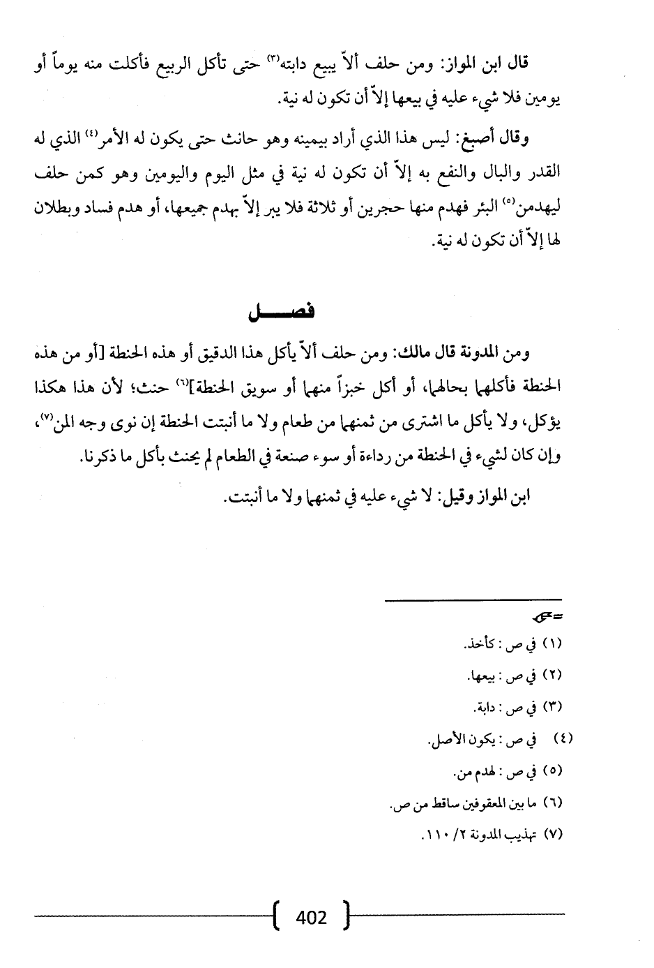 ومن المدونة قال مالك: ومن حلف ألا يأكل هذا الدقيق أو هذه الحنطة [أو من هذه الحنطة فأكلهما بحالهما، أو أكل خبزاً منهما أو سويق الحنطة] حنث؛ لأن هذا هكذا يؤكل، ولا يؤكل ما اشترى من ثمنهما من طعام ولا ما أنبتت الحنطة إن نوى وجه المن، وإن كان لشيء في الحنطة من رداءة أو سوء صنعة في الطعام لم يحنث بأكل ما ذكرنا.