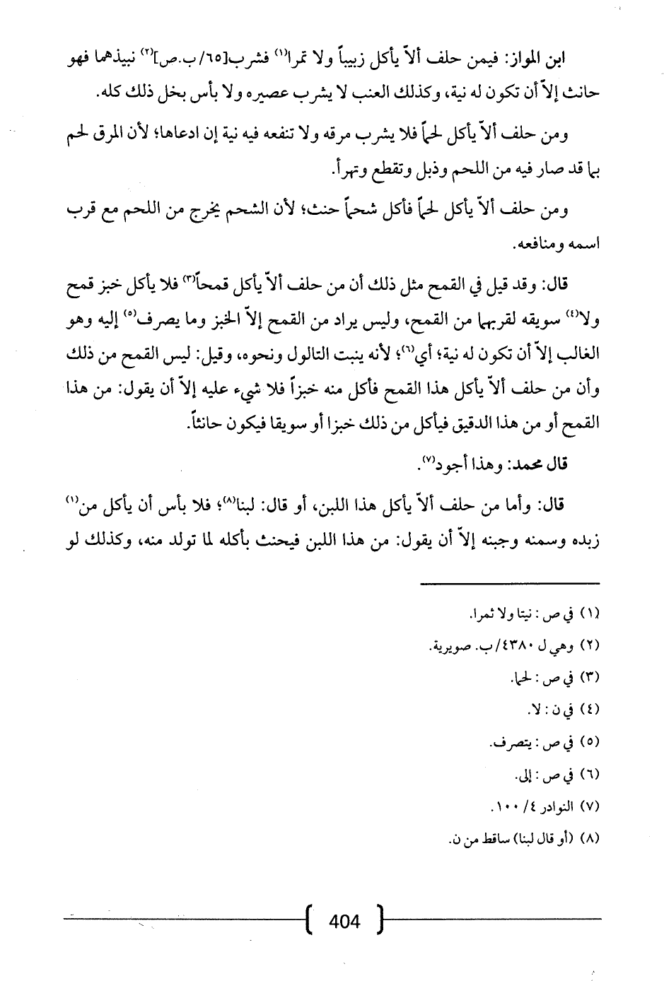 قال: وقد قيل في القمح مثل ذلك أن من حلف ألا يأكل قمحاً فلا يأكل خبز قمح ولا سويقه لقربهما من القمح، وليس يراد من القمح إلا الخبز وما يصرف إليه وهو الغالب إلا أن تكون له نية؛ أي؛ لأنه ينبت التالول ونحوه، وقيل: ليس القمح من ذلك وأن من حلف ألا يأكل هذا القمح فأكل منه خبزاً فلا شيء عليه إلا أن يقول: من هذا القمح أو من هذا الدقيق فيأكل من ذلك خبزاً أو سويقاً فيكون حانثاً.