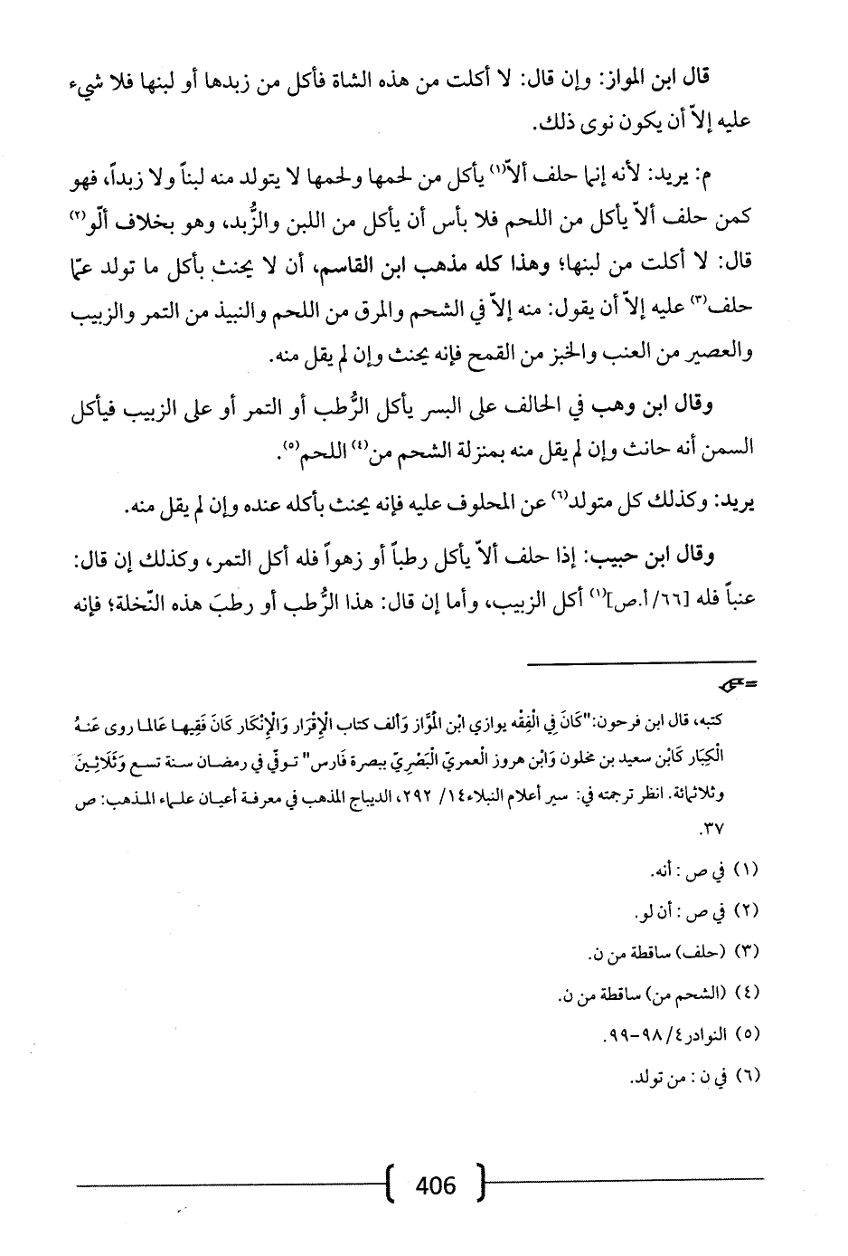 م: يريد: لأنه إنما حلف ألا يأكل من لحمها ولحمها لا يتولد منه لبناً ولا زبداً، فهو كمن حلف ألا يأكل من اللحم فلا بأس أن يأكل من اللبن والزبد، وهو بخلاف ألو قال: لا أكلت من لبنها؛ وهذا كله مذهب ابن القاسم، أن لا يحنث بأكل ما تولد عمها حلف عليه إلا أن يقول: منه إلا في الشحم والمرق من اللحم والنبيذ من التمر والزبيب والعصير من العنب والخبز من القمح فإنه يحنث وإن لم يقل منه.