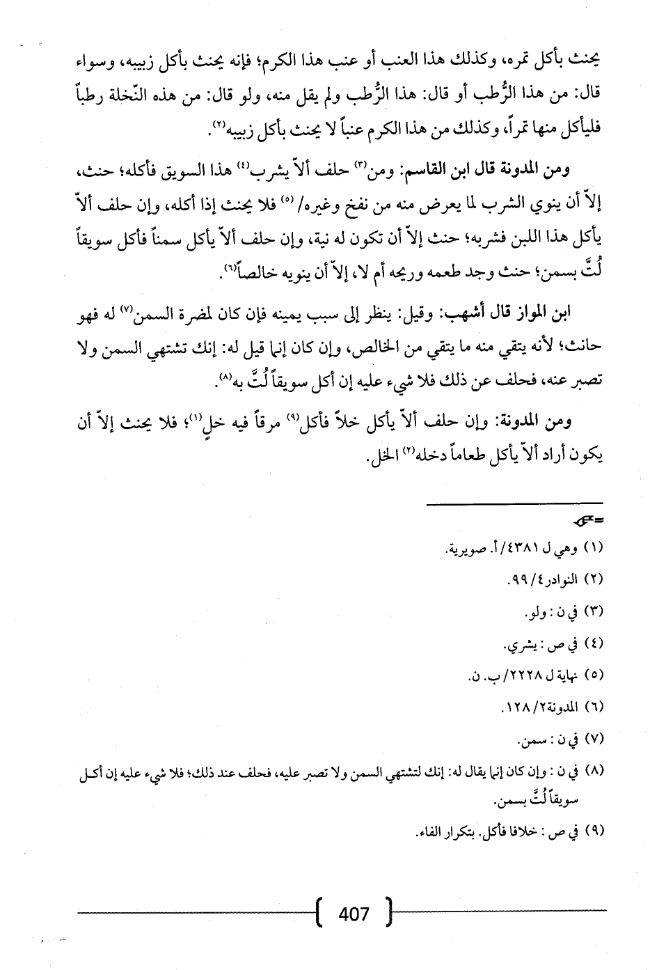 ابن المواز قال أشهب: وقيل: ينظر إلى سبب يمينه فإن كان لمضرة السمن له فهو حانث؛ لأنه يتقي منه ما يتقي من الخالص، وإن كان إنما قيل له: إنك تشتهي السمن ولا تصبر عنه، فحلف عن ذلك فلا شيء عليه إن أكل سويقاً لت به.